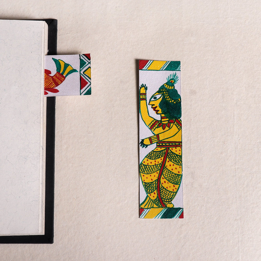 Traditional hand-painted manjusha bookmark with fabric colours on handmade paper. This classical manjusha art comes from Bihar from the family of Ulupi Jha. Manjusha art is believed to be the only art from in the history of art which has a sequential representation of the story and is displayed in a series. This is also called a scroll painting. Manjusha art is folk art of bhagalpur, Bihar and has been dated back to the 7th century.
