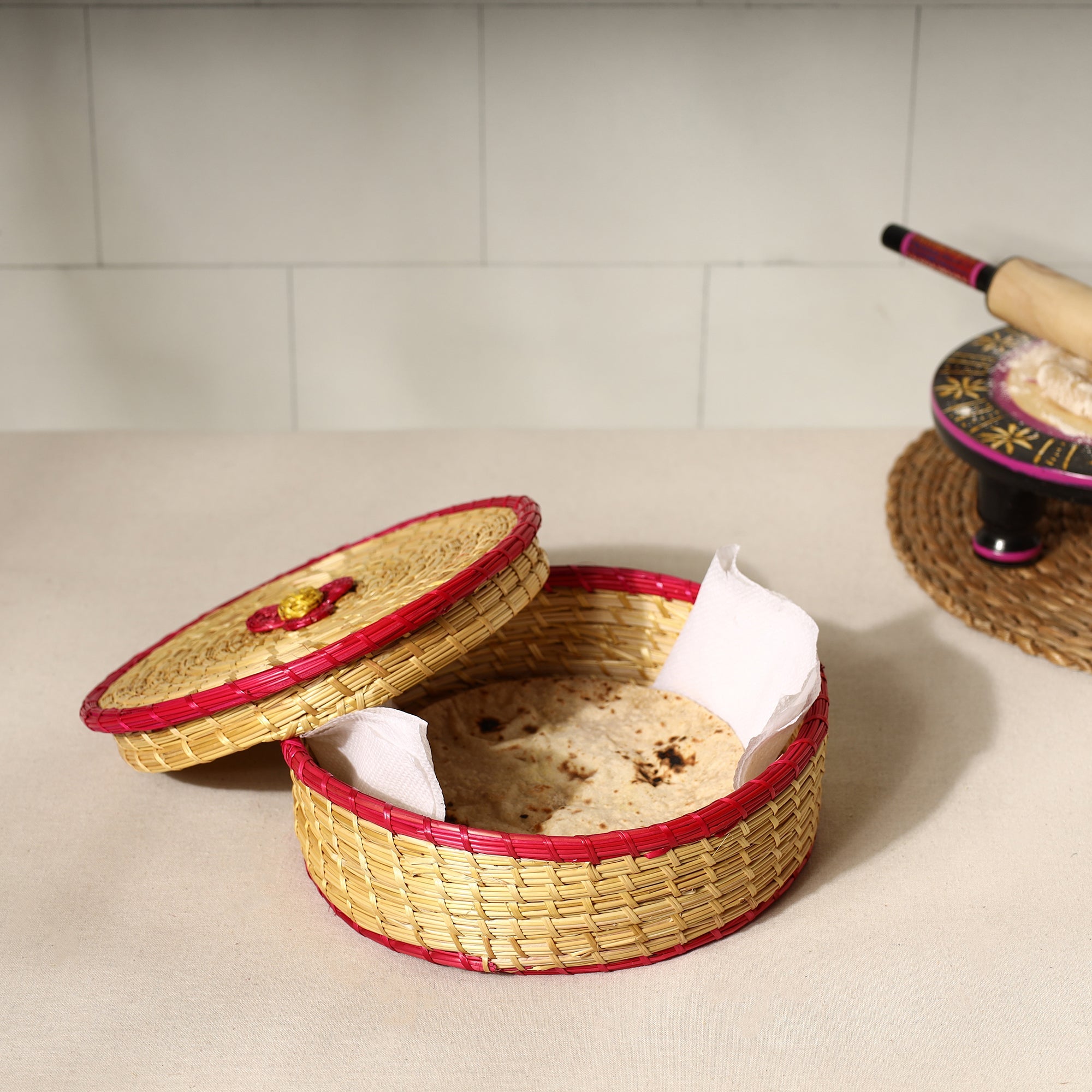 Handcrafted beige sikki grass weaved roti box, made with natural sikki grass.