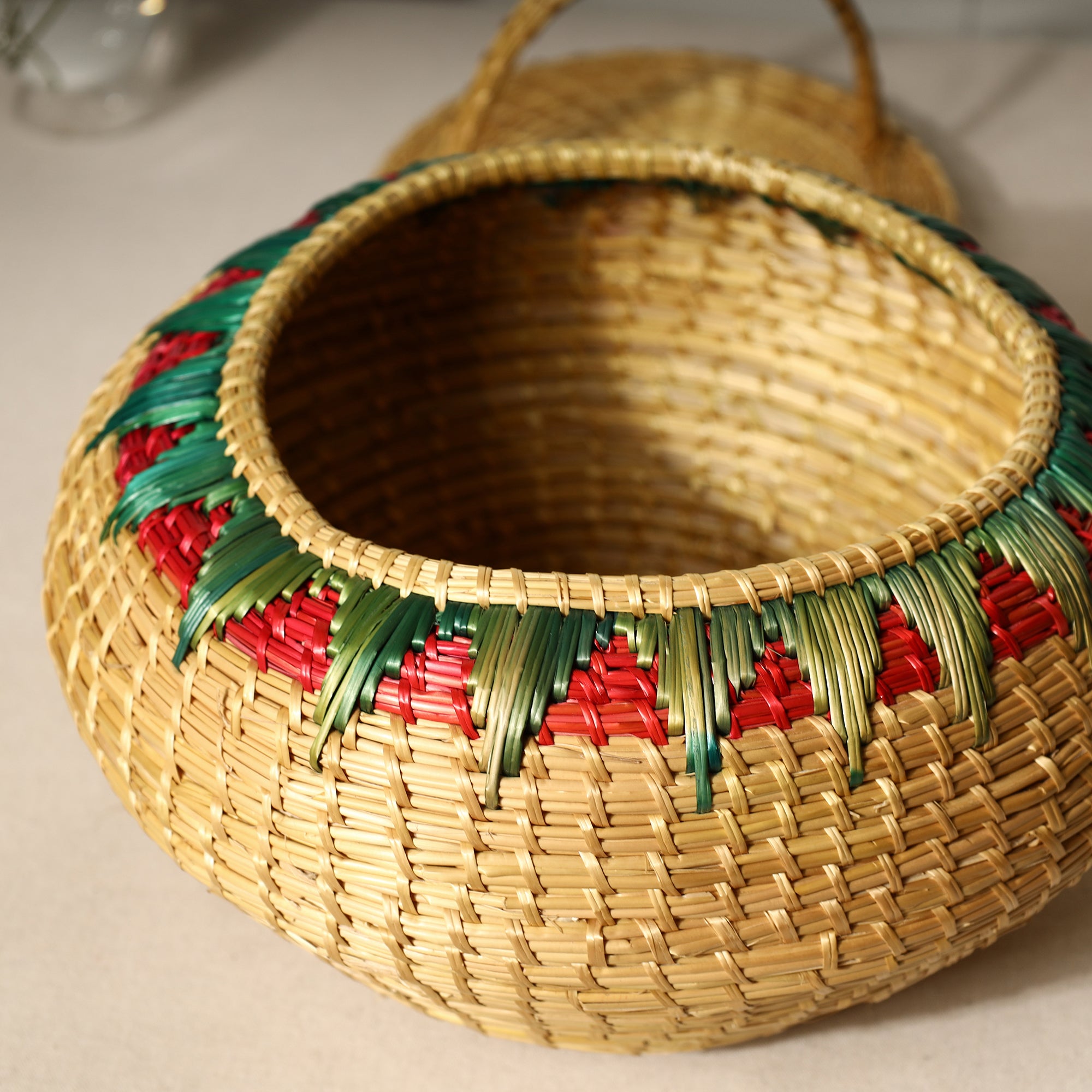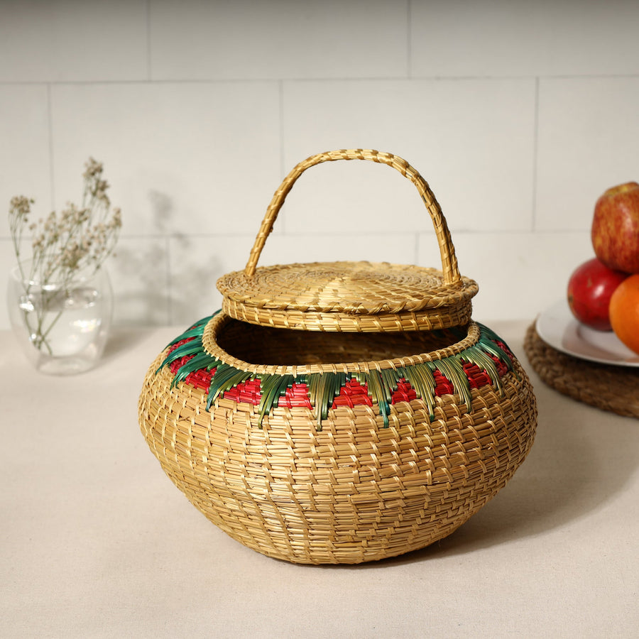 beige Handcrafted sikki grass weaved basket with lid, made with natural sikki grass.