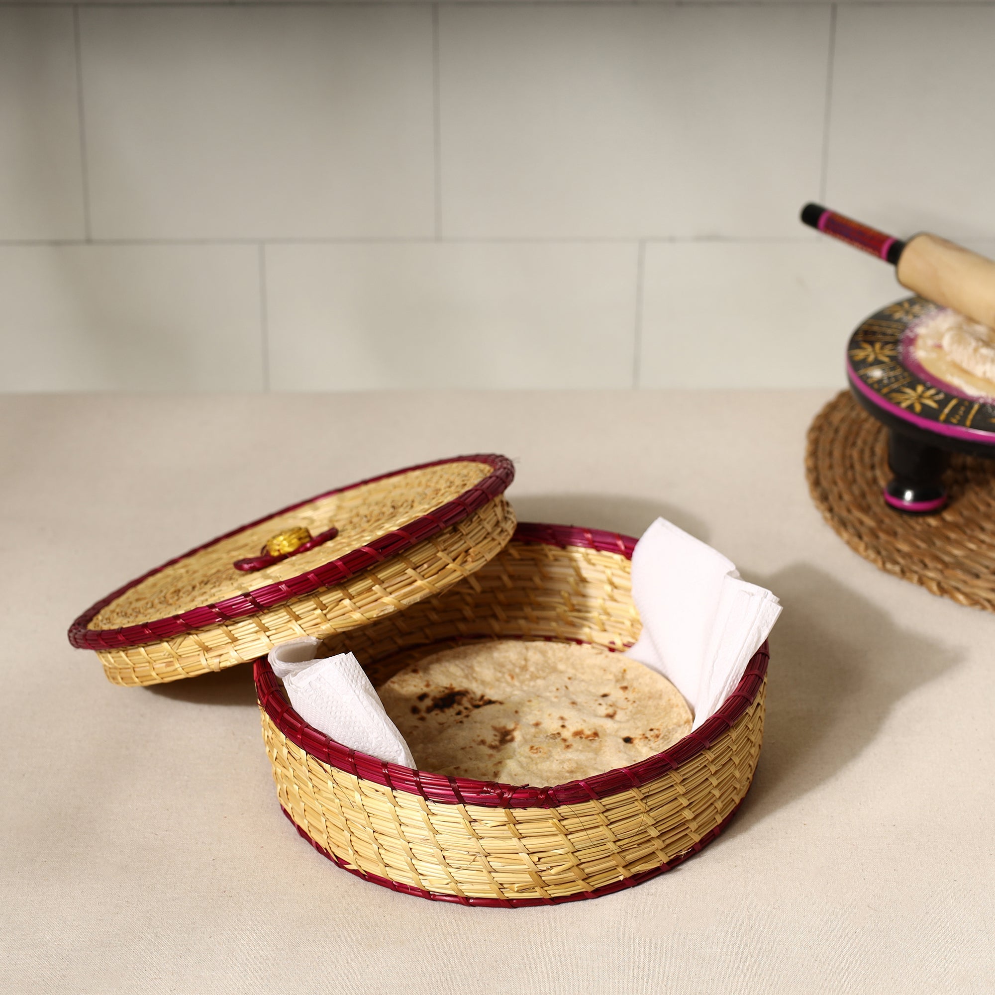 Handcrafted beige sikki grass weaved roti box, made with natural sikki grass.
