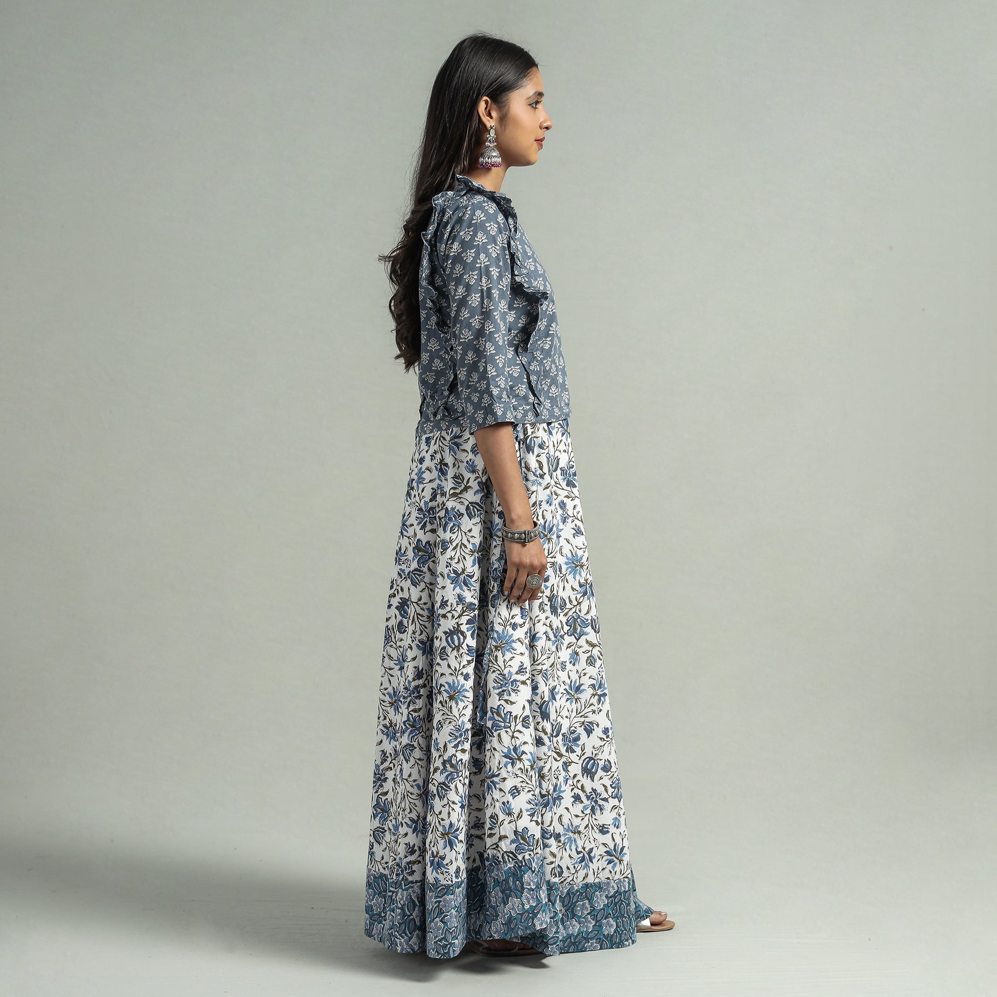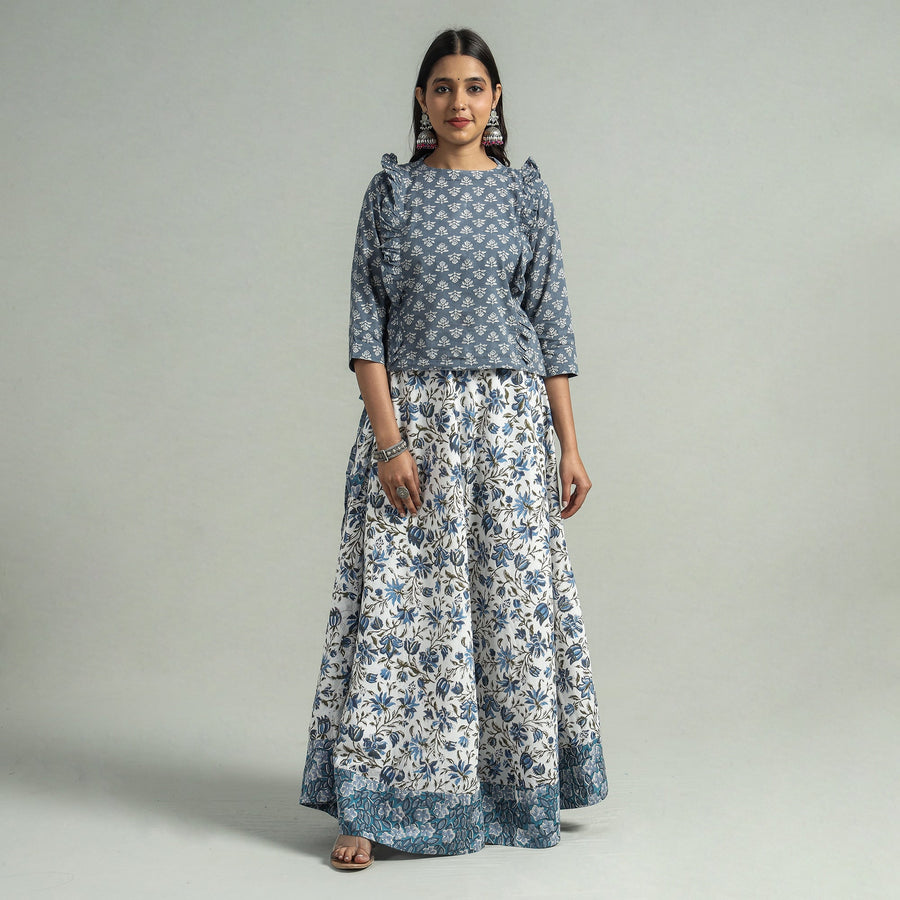 Fine quality white sanganeri hand block print cotton long skirt featuring a waist tie up closure. Sanganeri is a hand-block printing technique originating from Sanganer, a village in the southern part of Jaipur, Rajasthan. Bleed free VAT dyes used.