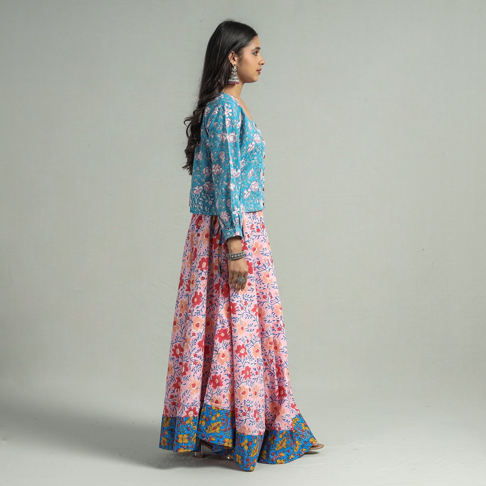 Fine quality pink sanganeri hand block print cotton long skirt featuring a waist tie up closure. Sanganeri is a hand-block printing technique originating from Sanganer, a village in the southern part of Jaipur, Rajasthan. Bleed free VAT dyes used.