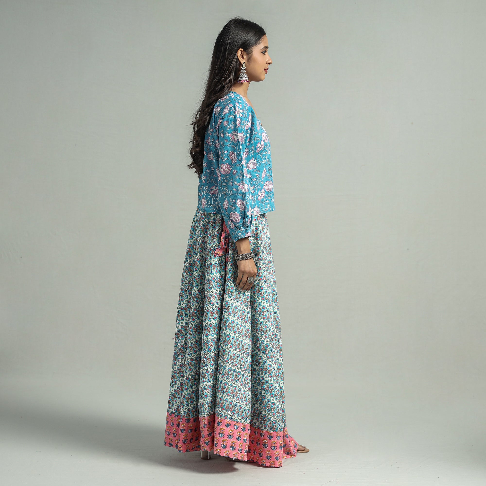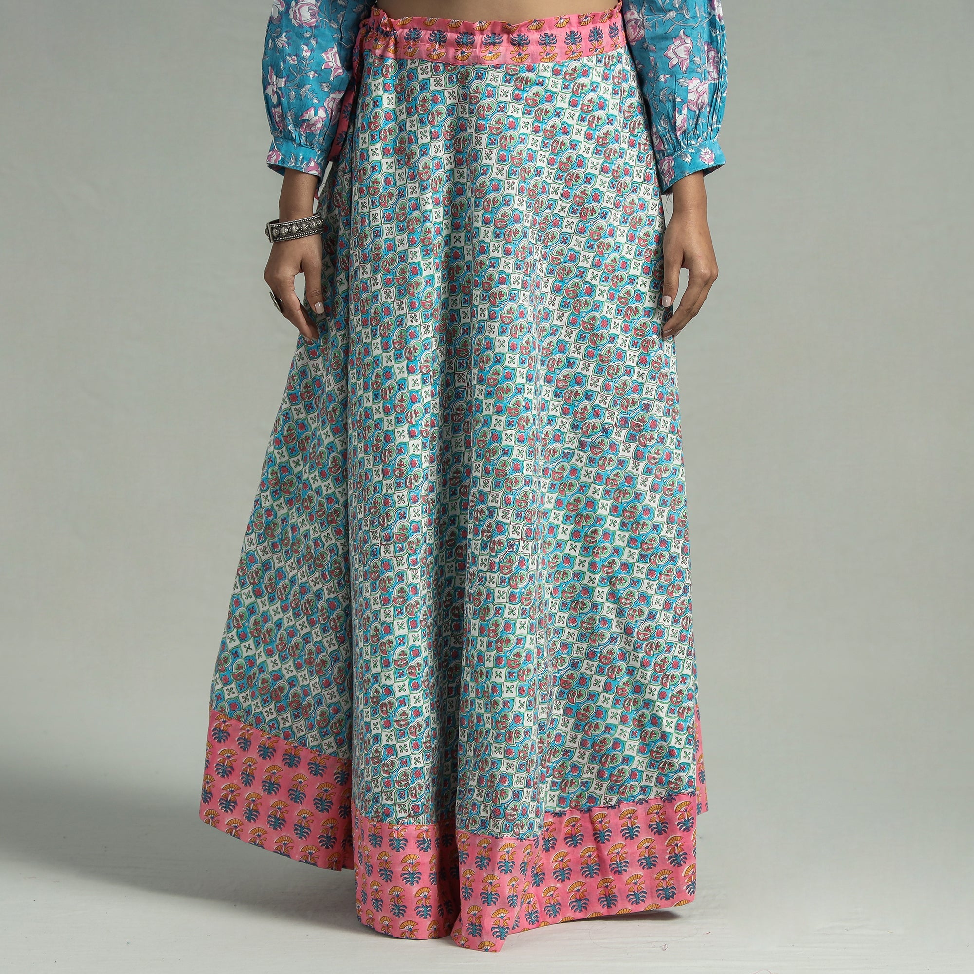 Fine quality blue sanganeri hand block print cotton long skirt featuring a waist tie up closure. Sanganeri is a hand-block printing technique originating from Sanganer, a village in the southern part of Jaipur, Rajasthan. Bleed free VAT dyes used.