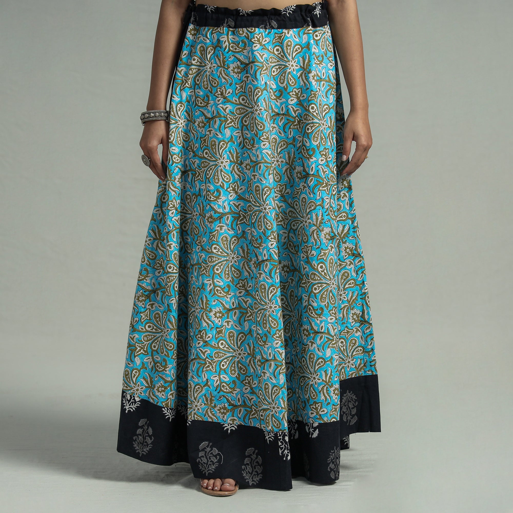 Fine quality blue sanganeri hand block print cotton long skirt featuring a waist tie up closure. Sanganeri is a hand-block printing technique originating from Sanganer, a village in the southern part of Jaipur, Rajasthan. Bleed free VAT dyes used.