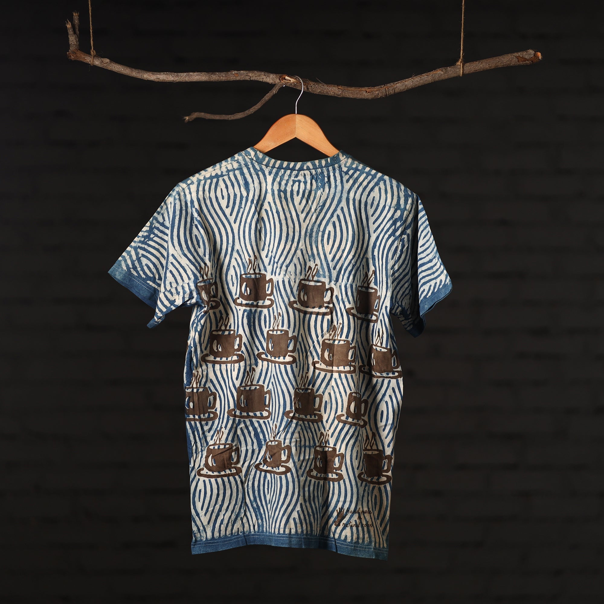 Pure cotton, natural dyed, hand block printed unisex round neck t-shirt. Contemporary designs made through traditional processes, by skilled fourth generation textile printers in Rajasthan. This slow fashion, hand block printed cotton t-shirt brings back the love for traditional skills, with a modern aesthetic and design.