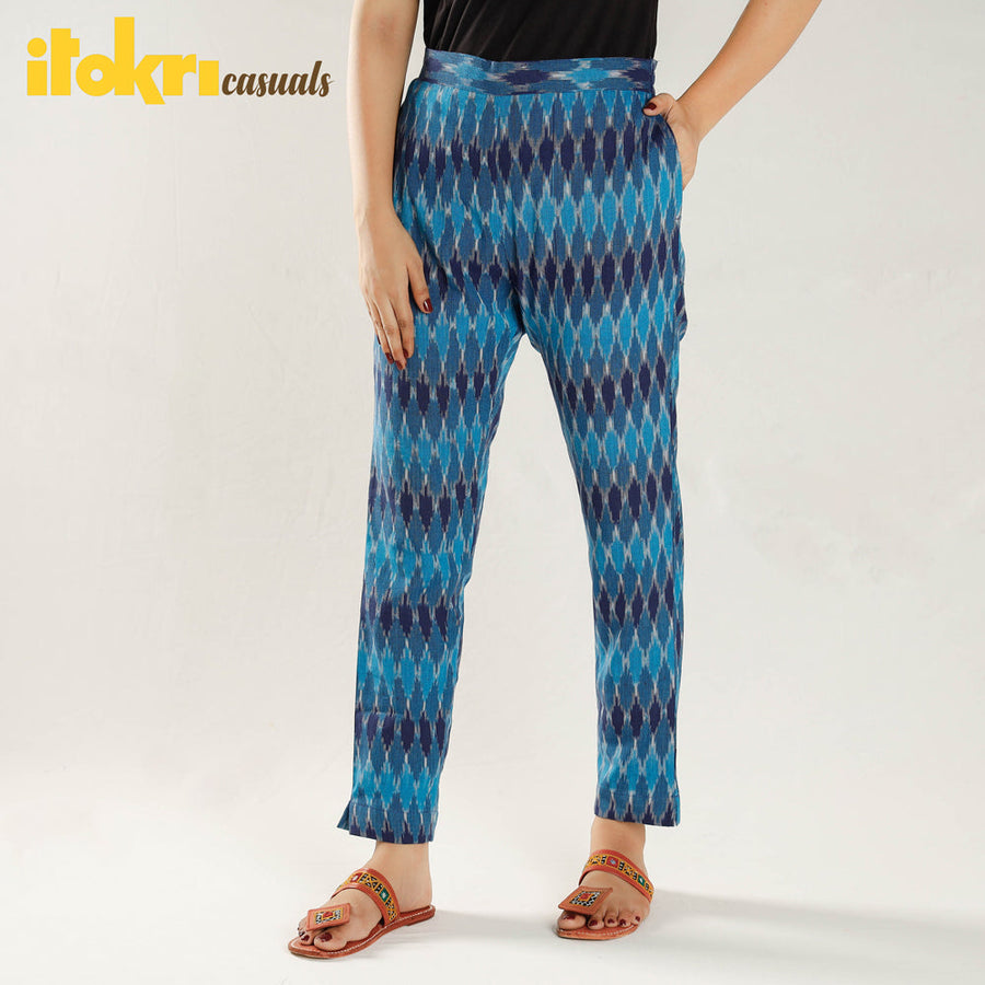 Feel and look beautiful in this pochampally ikat cotton tapered casual pant with side pockets, This cotton pant makes you feel comfortable and stylish all day long. This pant is perfect for your daily outings. Ikat (Ikkat) is a dyeing technique used to pattern textiles that employs a resist dyeing process similar to tie-dye on either the warp or weft fibers prior to dyeing. Ikat has lovely patterns and are world famous for their extremely beautiful colors, texture and designs. Indian Ikat is always admired by the fashion designers around the world.