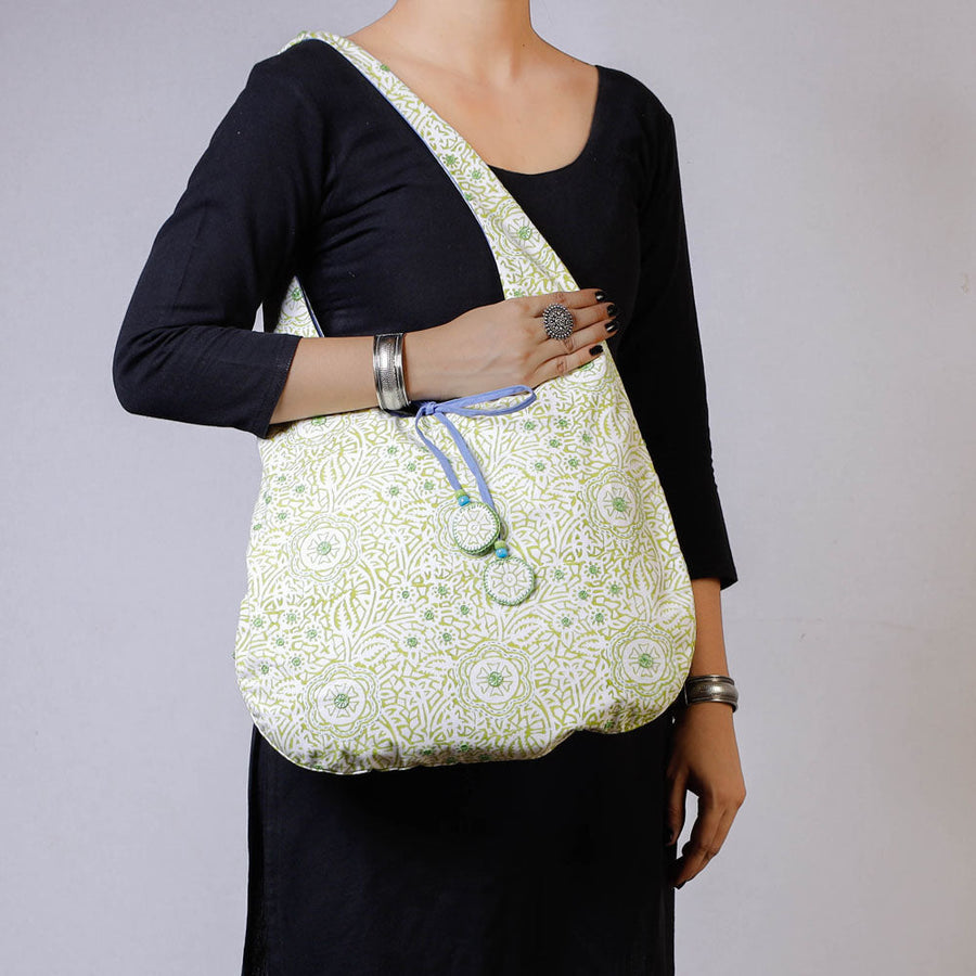 Green handcrafted shoulder bag made from handblock printed cotton fabric with kantha work. It has one velcro pocket by Dastkar Ranthambhore from Rajasthan.