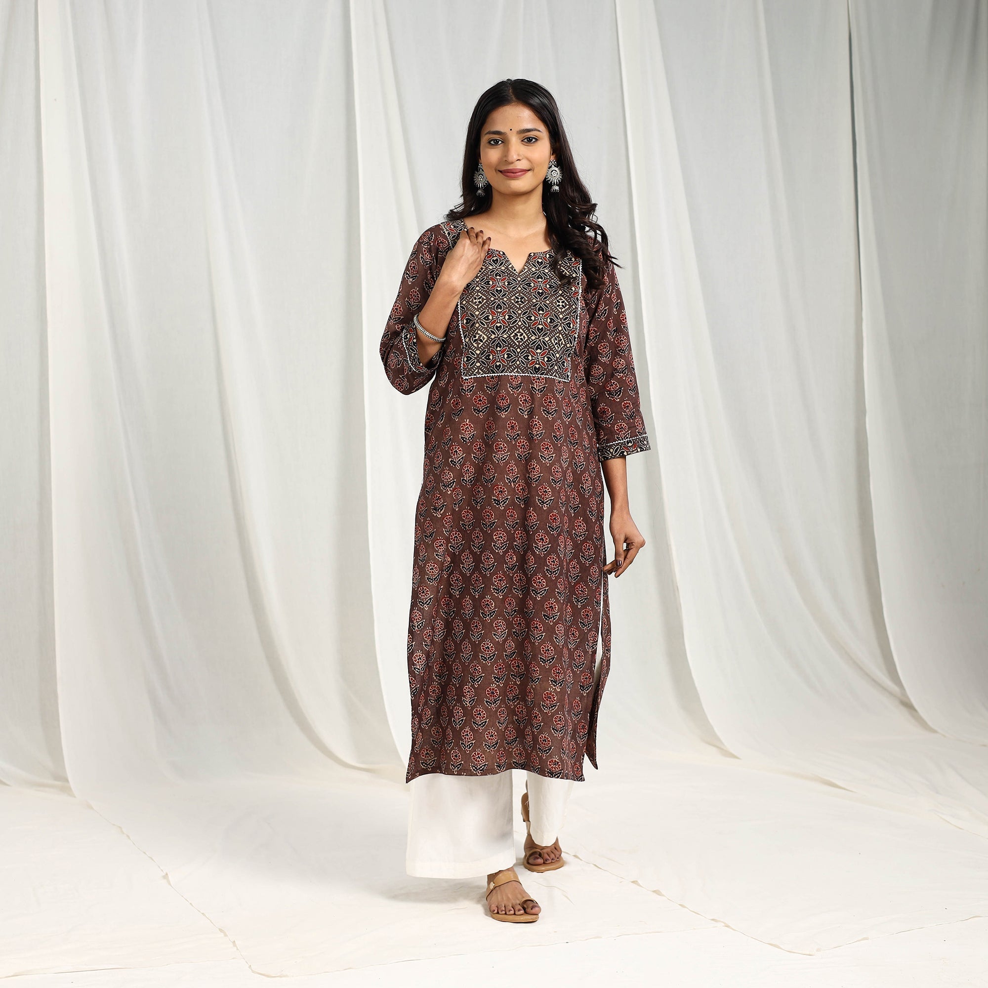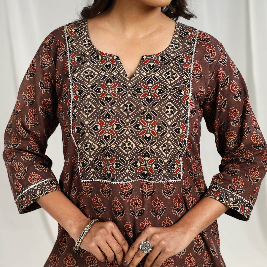 • Brown Block Printed Cotton Straight Ajrakh Kurta for Women