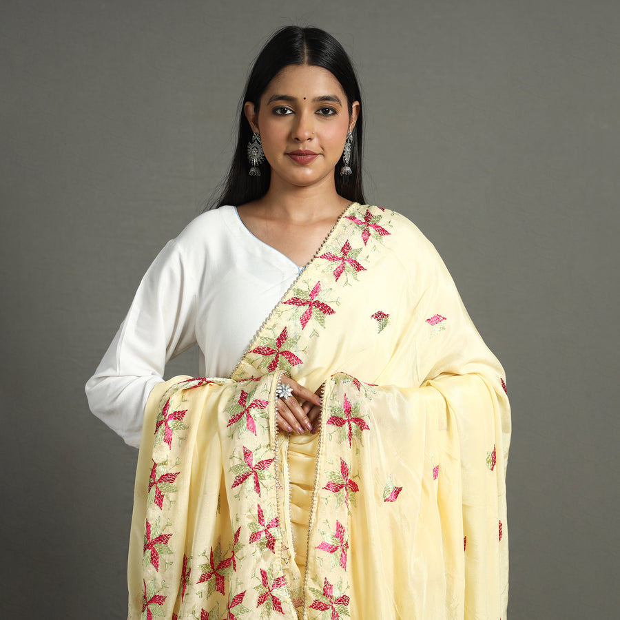 White - Ranihati Chapa Work Chanderi Silk Hand Embroidery Dupatta 131