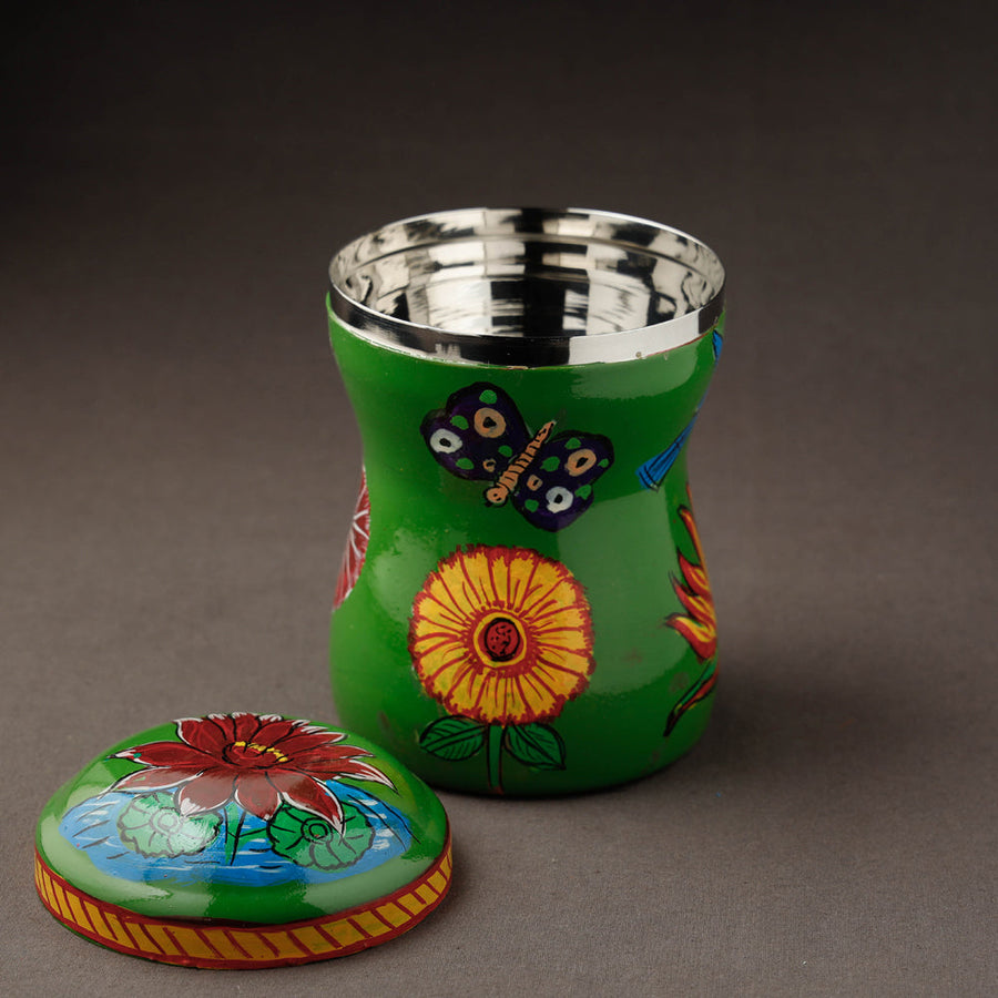 Green kavad handpainted stainless steel multi utility canister with waterproof oil based paint on very high quality stainless steel by the artisans of Mewar Rajasthan.
