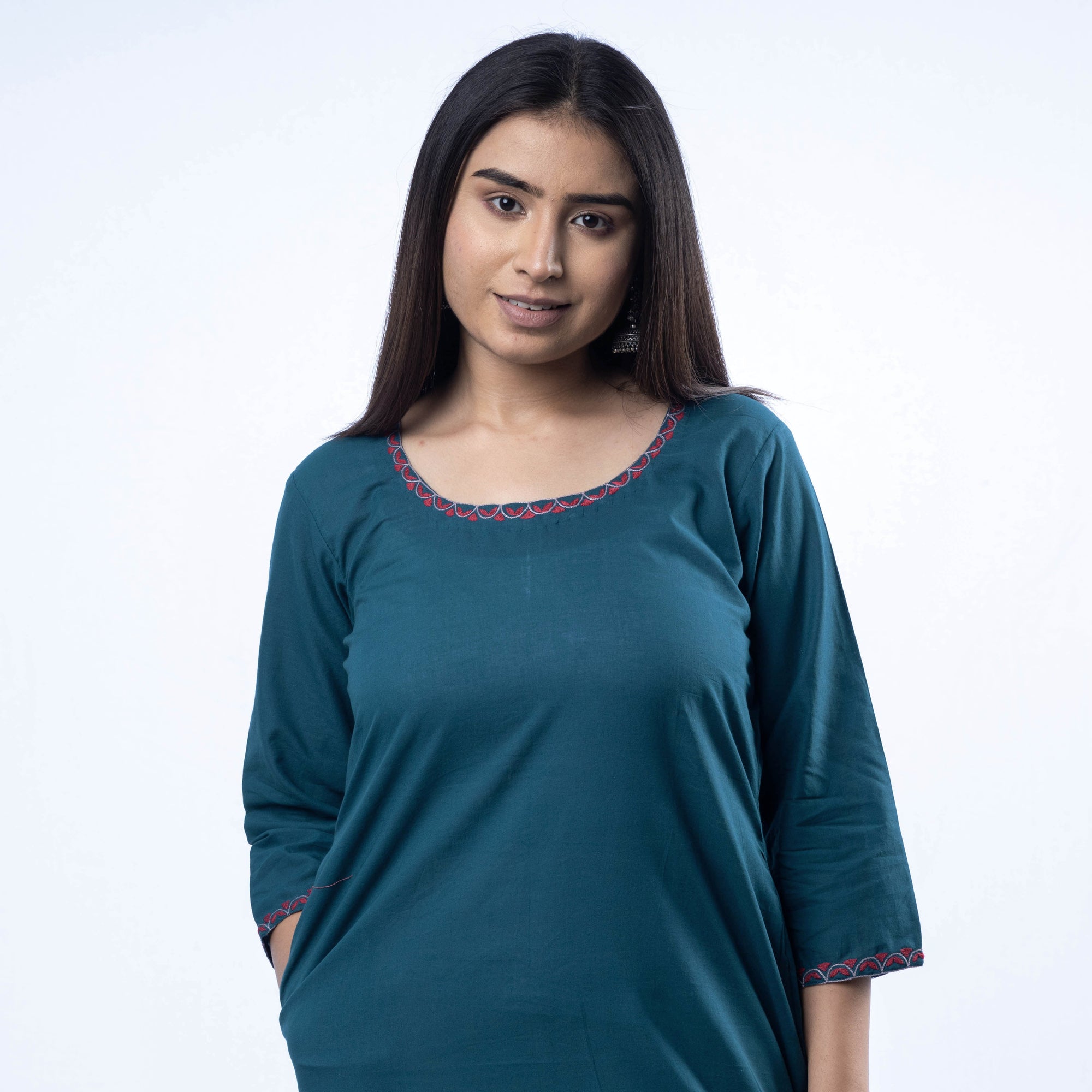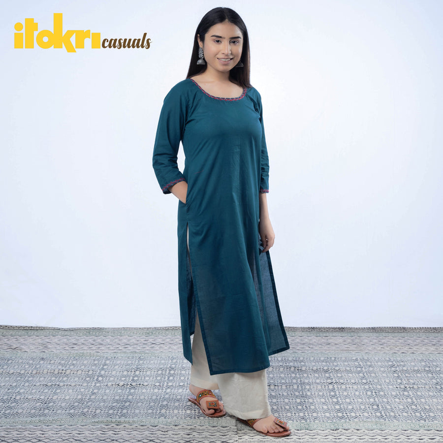 Look and feel beautiful in this uniquely designed hand embroidered plain cotton long kurta with side pocket. This cotton kurta makes you comfortable with ease all day long. This kurta is perfect for your daily outing and for a special occasion.
