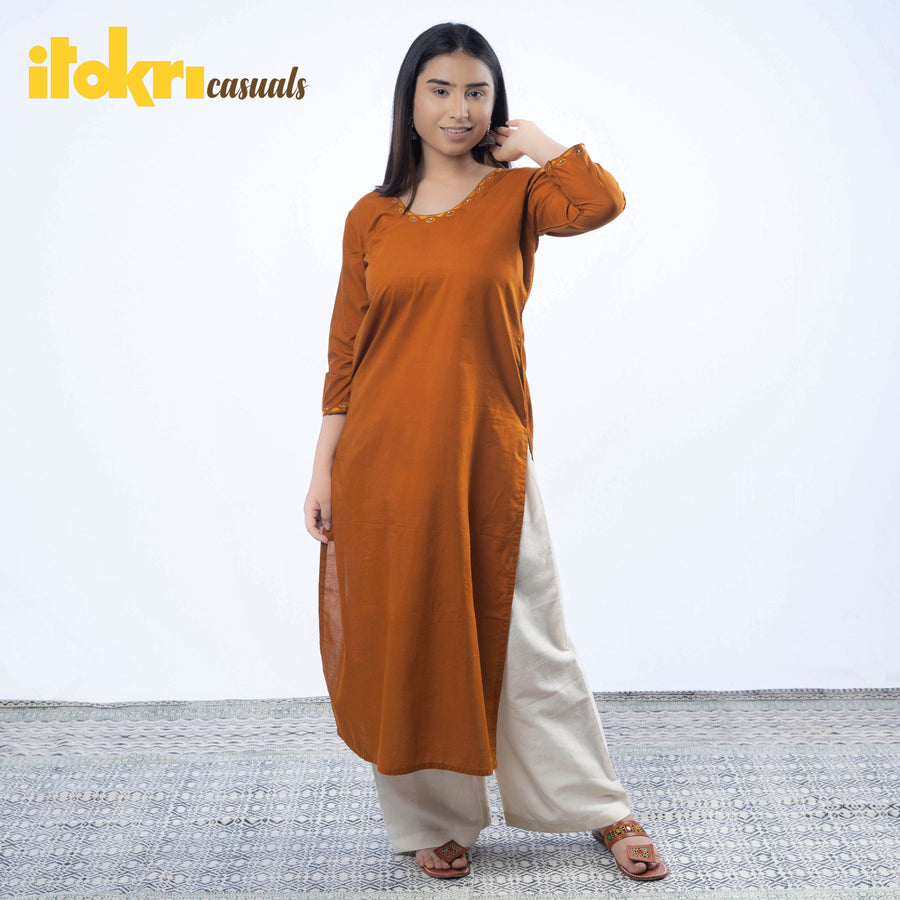 Look and feel beautiful in this uniquely designed hand embroidered plain cotton long kurta with side pocket. This cotton kurta makes you comfortable with ease all day long. This kurta is perfect for your daily outing and for a special occasion.