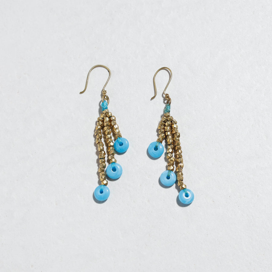 Yellow handcrafted brass metal alloy dokra beads & threadwork earrings handmade by tribes. Dokra system of metal casting is said to be the oldest form of metal casting and is technically known as ‘cire perdue’ or lost wax process. The technique of casting revolves round replacement of wax with molten metal by the traditional hollow casting method. Very intense process of Dhokra casting is currently practiced in tribal areas of India mostly around Chhattisgarh and Orissa.
