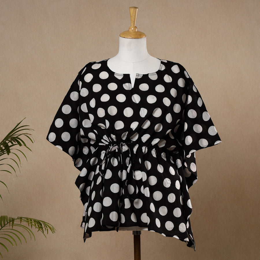 Fine quality hand printed cotton kaftan with tie-up waist. A traditional kaftan or caftan is an short-length garment with long, flowing sleeves. It has an adjustable drawstring waist. These loose-fitting cotton kaftans are enhanced by a soft touch and beautiful hand prints. This dress will allow you to move with ease and comfort. The drawstring waist tie will give you the freedom to customize the fit to suit your unique shape.