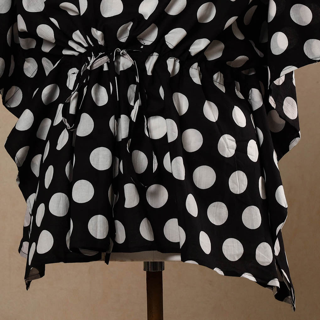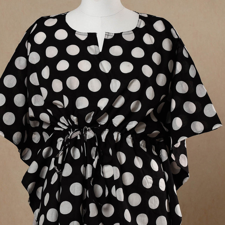 | Material | Fine quality hand printed cotton kaftan with tie-up waist. A traditional kaftan or caftan is an short-length garment with long, flowing sleeves. It has an adjustable drawstring waist. These loose-fitting cotton kaftans are enhanced by a soft touch and beautiful hand prints. This dress will allow you to move with ease and comfort. The drawstring waist tie will give you the freedom to customize the fit to suit your unique shape. |