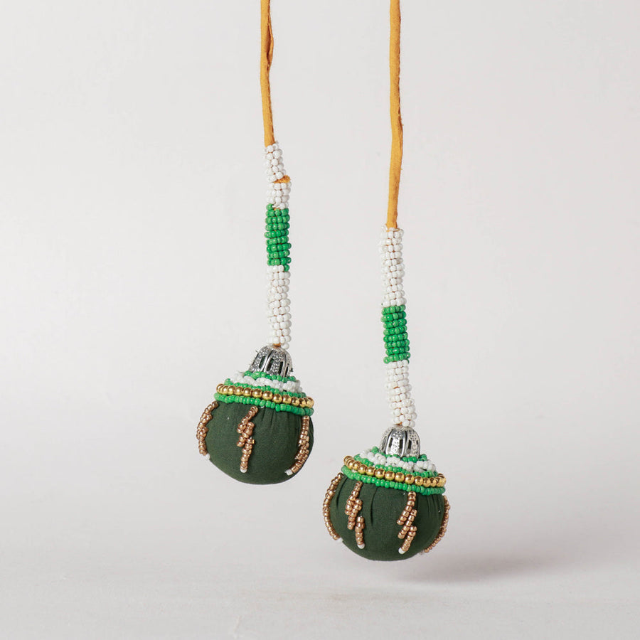 | Material | Pair of green handmade cotton thread and bead work latkan/tassels for clothing. |