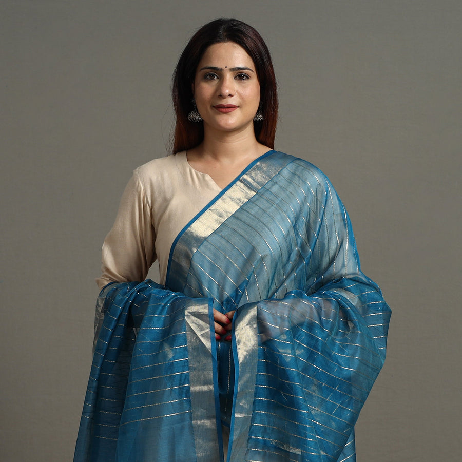 Fine quality traditional chanderi silk-cotton pure handloom zari stripe dupatta with intricate zari weaving by master artisan Rauph Khan. Chanderi silks are known for its gossamer looks and amazing feel. Chanderi weaving is practiced in the historic town of Chanderi in Madhya Pradesh. The buttis or motifs on chanderi blend are primarily hand woven on handloom, with the use of needles. Separate needles are used to create different motifs.