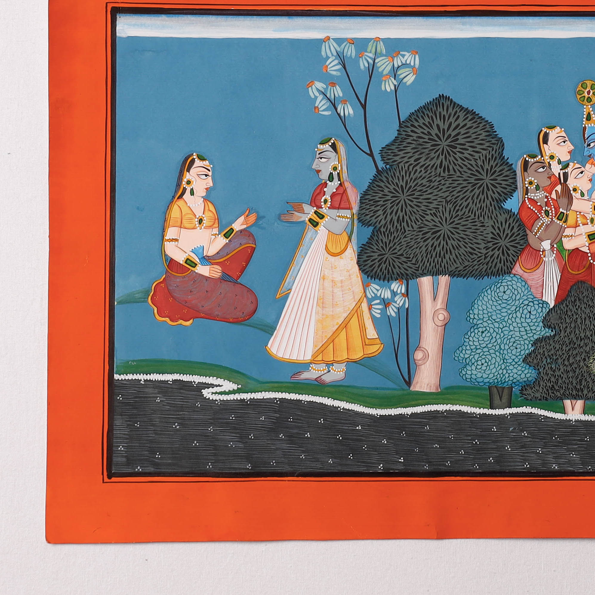 Traditional hand-painted basohli art with stone and poster colour on chart paper. This classical Indian art comes from Jammu and Kashmir. A wonderful painting for the discerning decor aficionado or a gift for an art lover. These are priceless collectibles. The Basohli paintings have peculiar characteristics: stylized faces dominated by large, intense eyes. The most astonishing quality of Basohli painting is the use of homemade colours made from the roots, flowers, leaves, and bark of the trees.