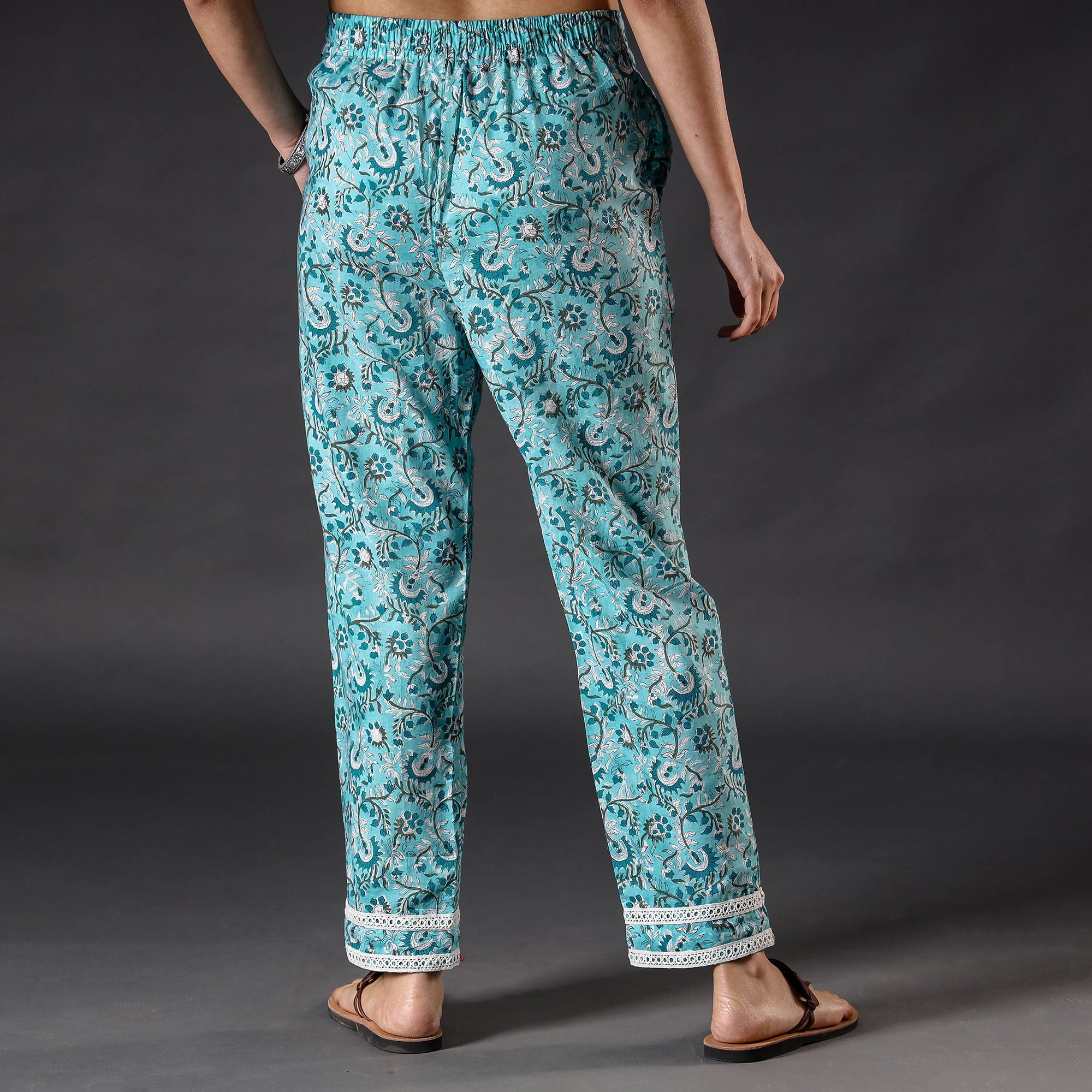 Feel and look beautiful in this sky blue sanganeri block-printed cotton, elasticated casual pant with side pockets. This cotton pant makes you feel comfortable and stylish all day long. This pant is perfect for your daily outings. Sanganeri is a hand-block printing technique originating from Sanganer, a village in the southern part of Jaipur, Rajasthan. Bleed free VAT dyes used.