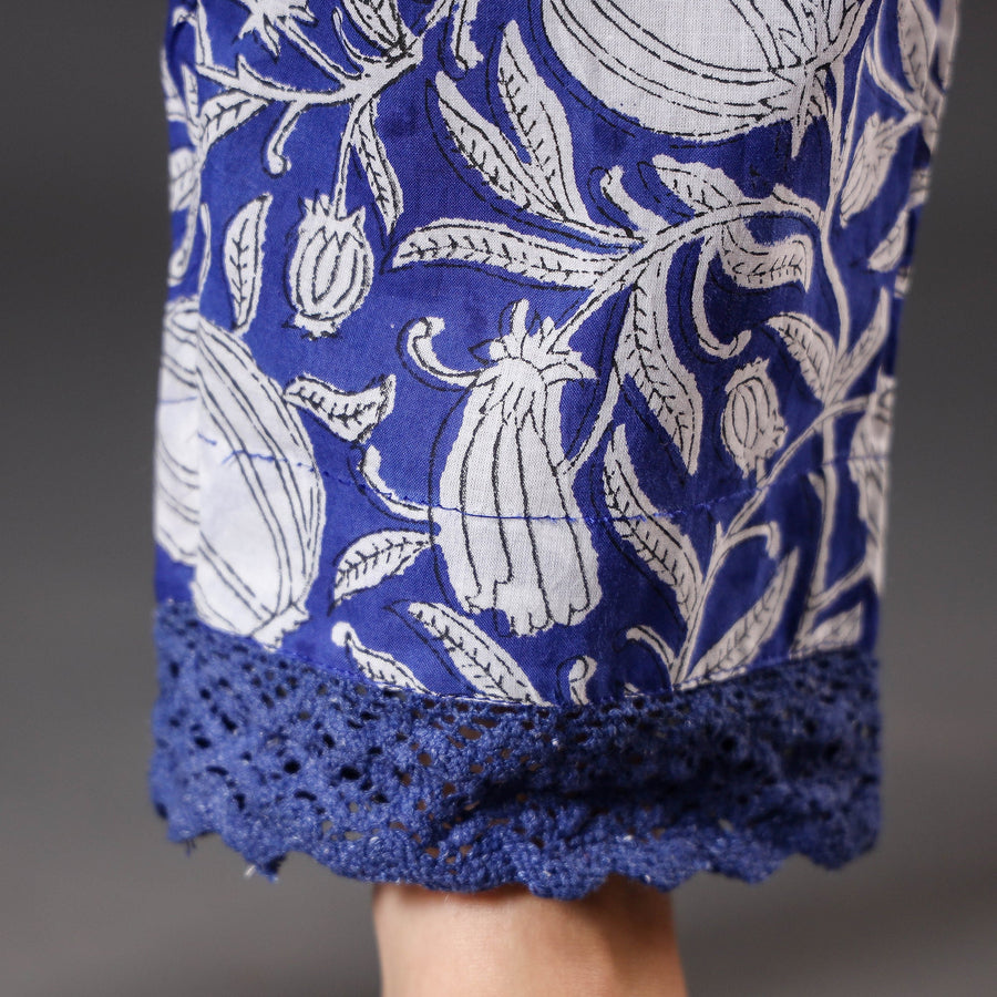 Feel and look beautiful in this rich blue sanganeri block-printed cotton, elasticated casual pant with side pockets. This cotton pant makes you feel comfortable and stylish all day long. This pant is perfect for your daily outings. Sanganeri is a hand-block printing technique originating from Sanganer, a village in the southern part of Jaipur, Rajasthan. Bleed free VAT dyes used.