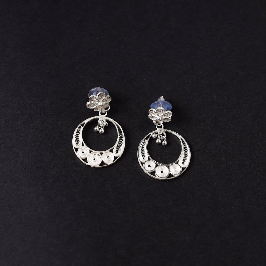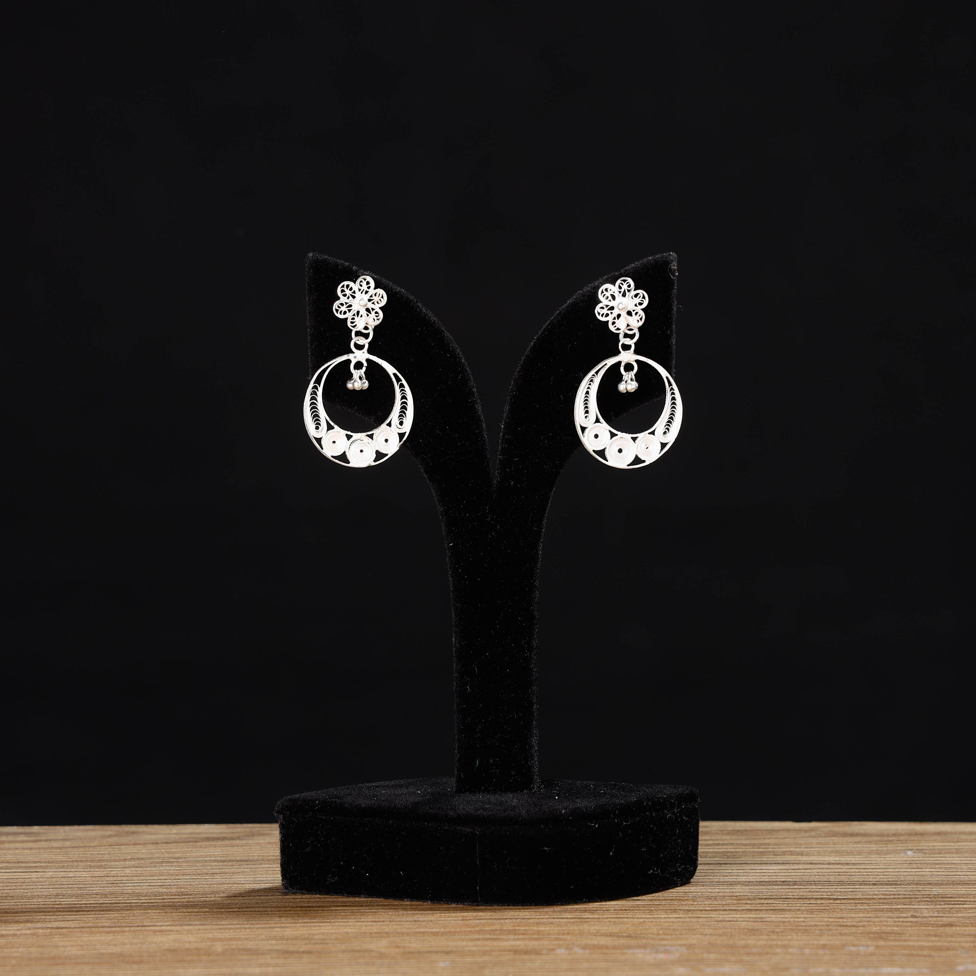 White hand-crafted filigree circular shaped sterling silver earrings from Kalinga, Odisha. This product is made by artisans working traditionally with precious ornaments. (made of 92.5% sterling silver) Featuring an eye-catching design and excellent finish, these filigree silver earrings are a must-have in your accessory collection. Filigree is a beautiful form of metalwork. It originated in the ancient world. It is also known as Telkari (from the Anatolian word meaning "wire work"). It is formed using delicate twisted threads of silver, often with repeated curvy motifs, that suggest lace. These fine wire pieces are then soldered together to create a larger piece. This technique became very popular in French fashion jewelry, from 1660 to the present. But its exquisite feminine look is in fashion every year!