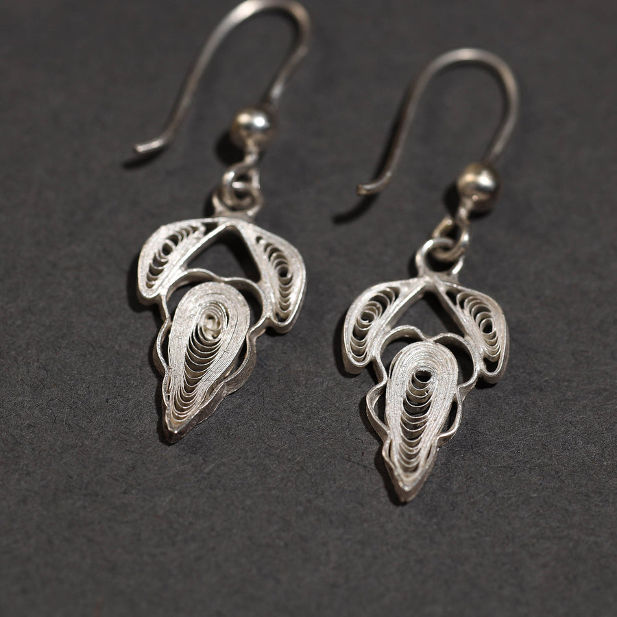 White hand-crafted filigree quiling design sterling silver earrings from Kalinga, Odisha. This product is made by artisans working traditionally with precious ornaments. (made of 92.5% sterling silver) Featuring an eye-catching design and excellent finish, these filigree silver earrings are a must-have in your accessory collection. Filigree is a beautiful form of metalwork. It originated in the ancient world. It is also known as Telkari (from the Anatolian word meaning "wire work"). It is formed using delicate twisted threads of silver, often with repeated curvy motifs, that suggest lace. These fine wire pieces are then soldered together to create a larger piece. This technique became very popular in French fashion jewelry, from 1660 to the present. But its exquisite feminine look is in fashion every year!