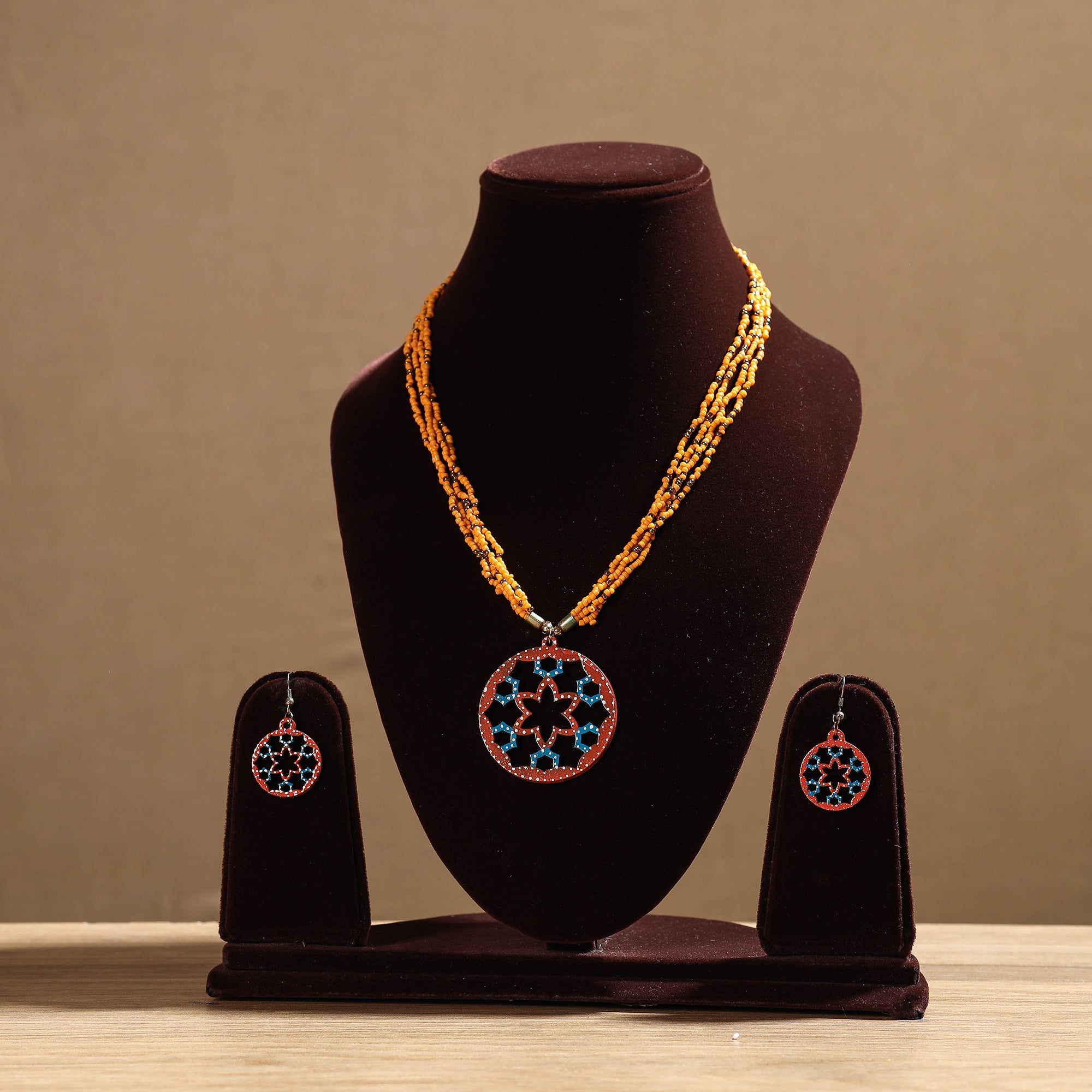 Beautifully orange handcrafted wooden necklace set made of mdf wood with tikuli handpainted miniature painting. (oil colours used) Can match any type of outfit.