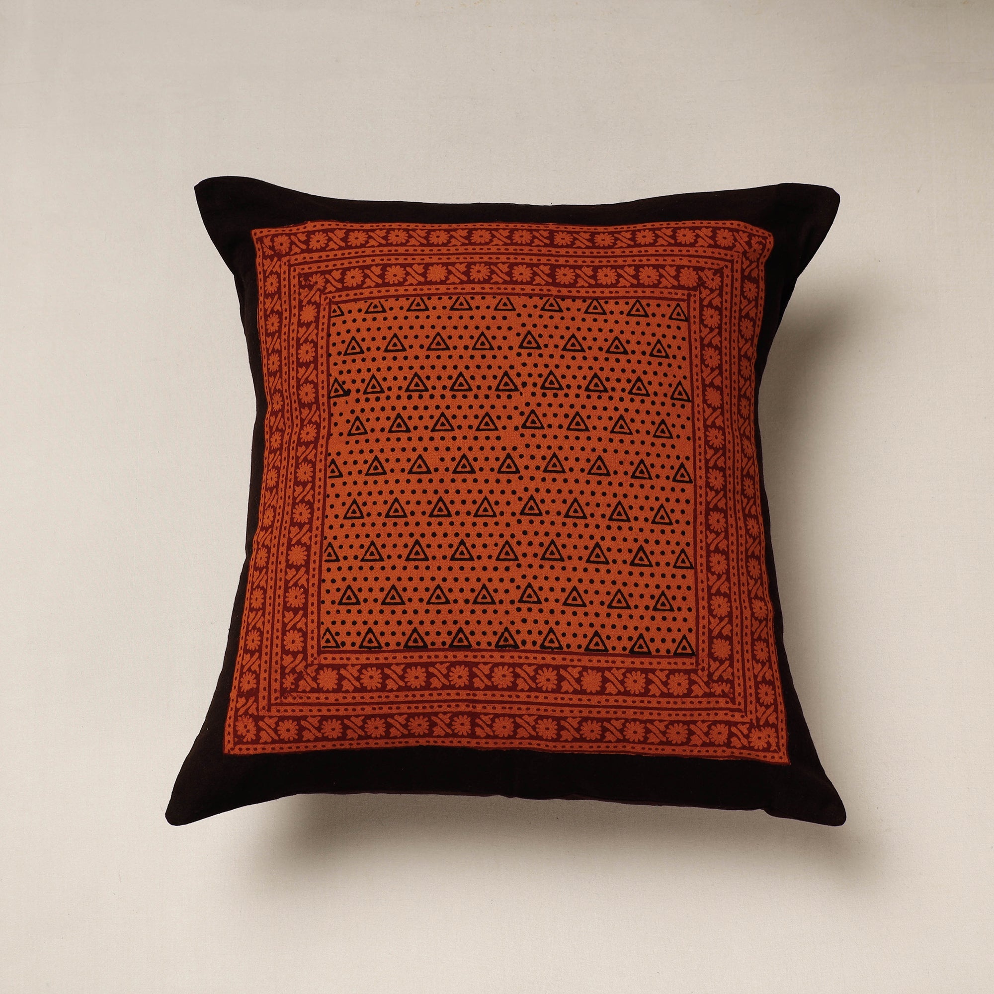 Fine quality orange bagh block printing cotton cushion cover, made using natural dyes through traditional processes by master artisan practiced in Bagh, the Dhar district of Madhya Pradesh.