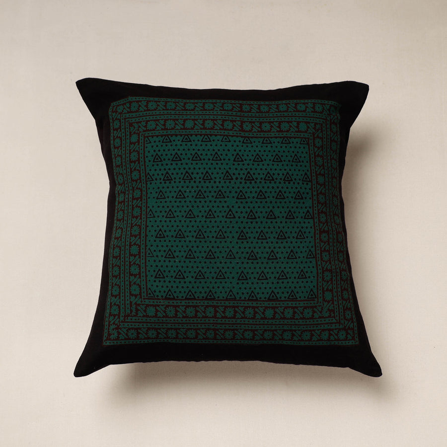 Fine quality green bagh block printing cotton cushion cover, made using natural dyes through traditional processes by master artisan practiced in Bagh, the Dhar district of Madhya Pradesh.