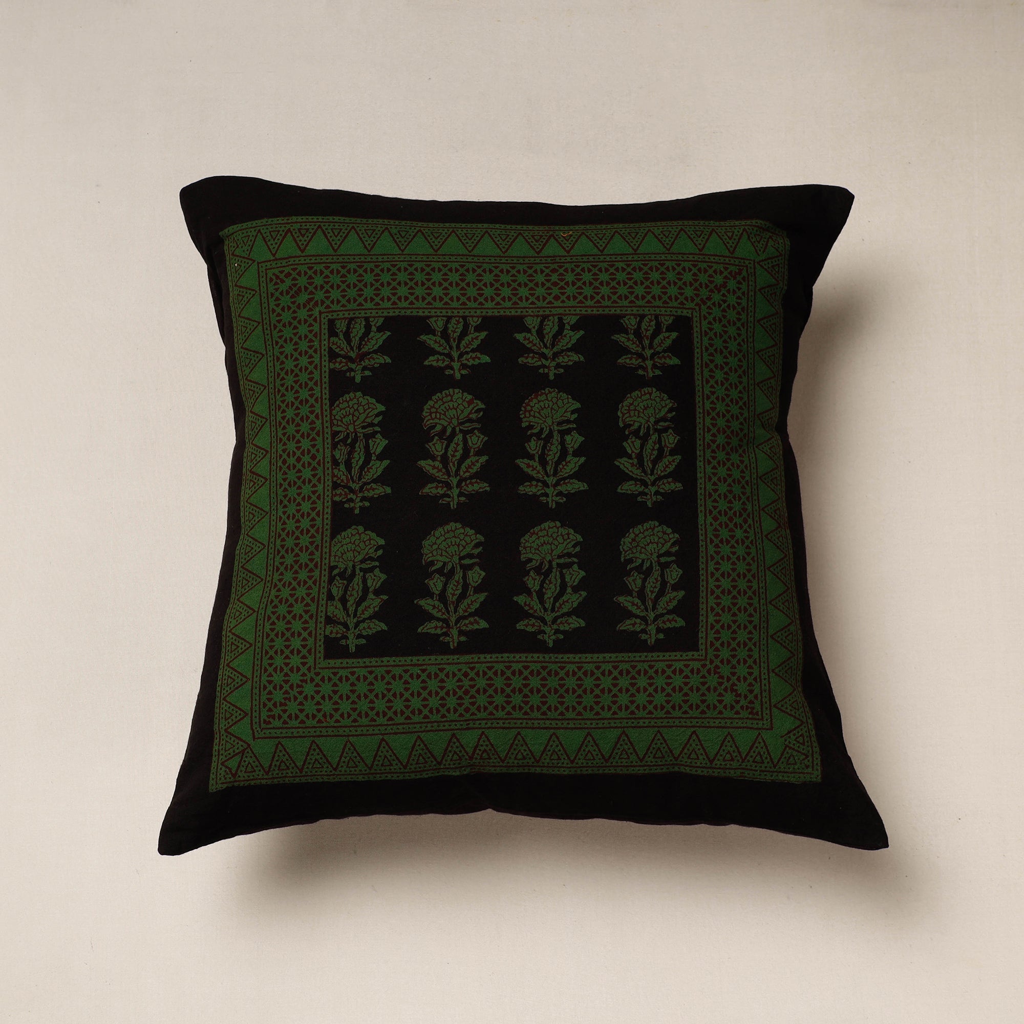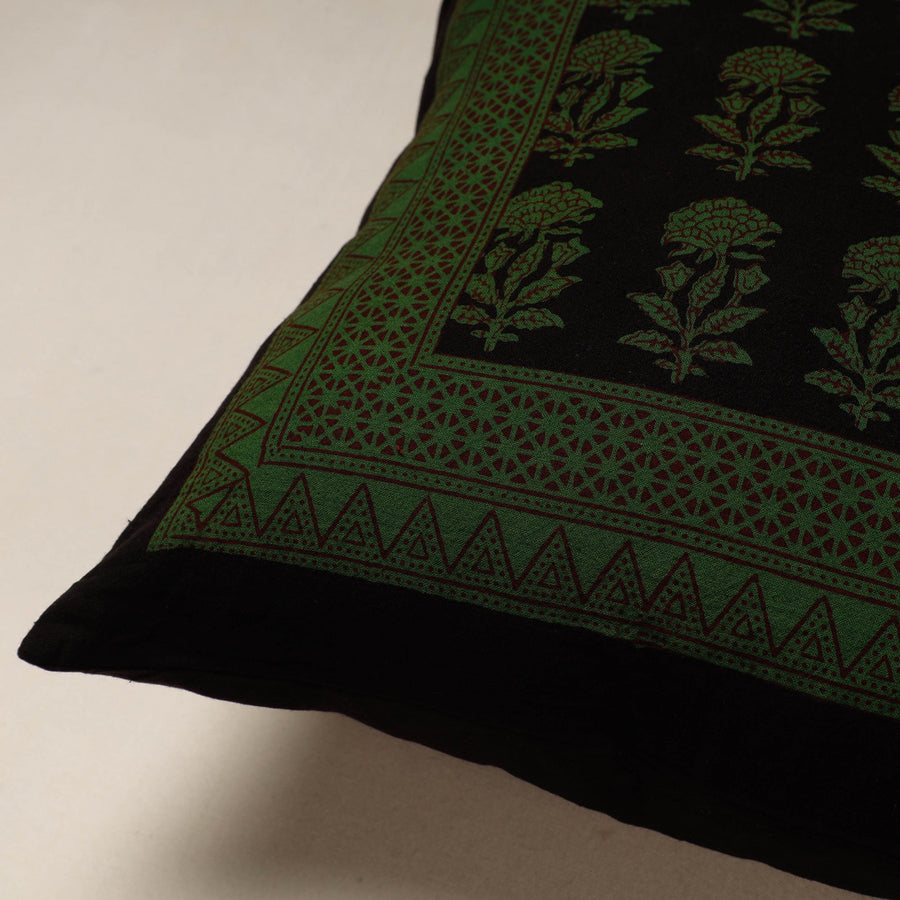 Fine quality green bagh block printing cotton cushion cover, made using natural dyes through traditional processes by master artisan practiced in Bagh, the Dhar district of Madhya Pradesh.