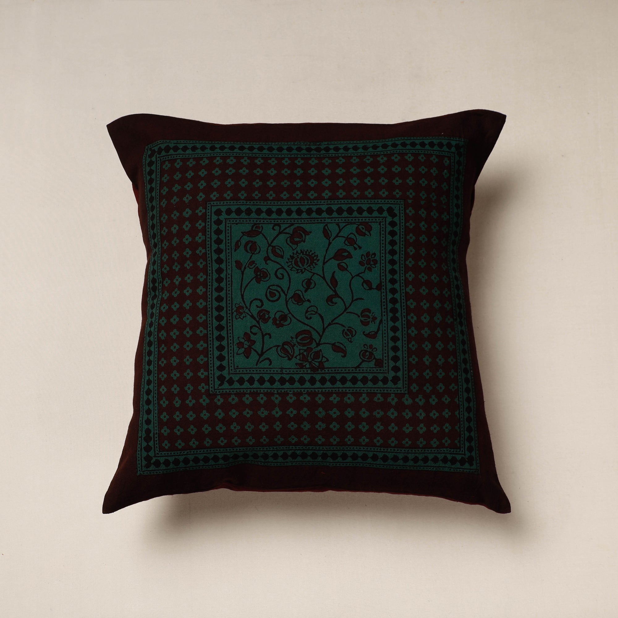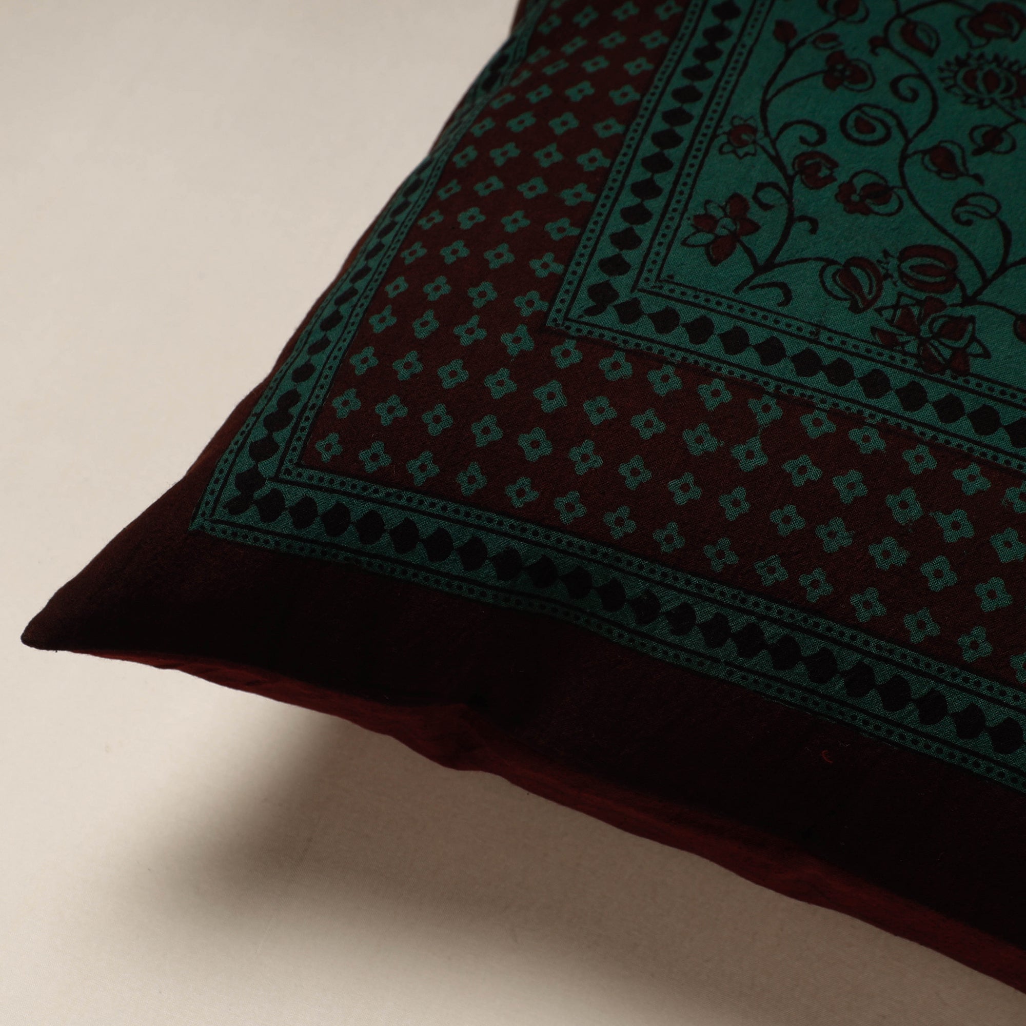Fine quality green bagh block printing cotton cushion cover, made using natural dyes through traditional processes by master artisan practiced in Bagh, the Dhar district of Madhya Pradesh.