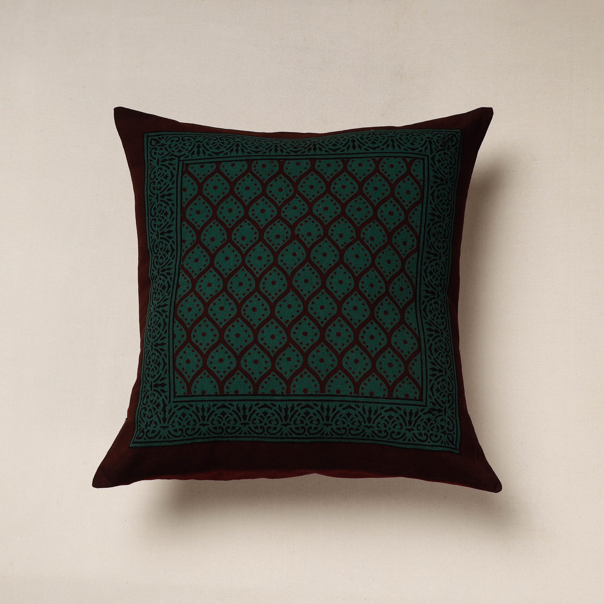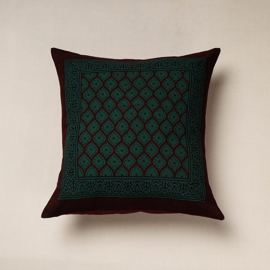 Fine quality green bagh block printing cotton cushion cover, made using natural dyes through traditional processes by master artisan practiced in Bagh, the Dhar district of Madhya Pradesh.