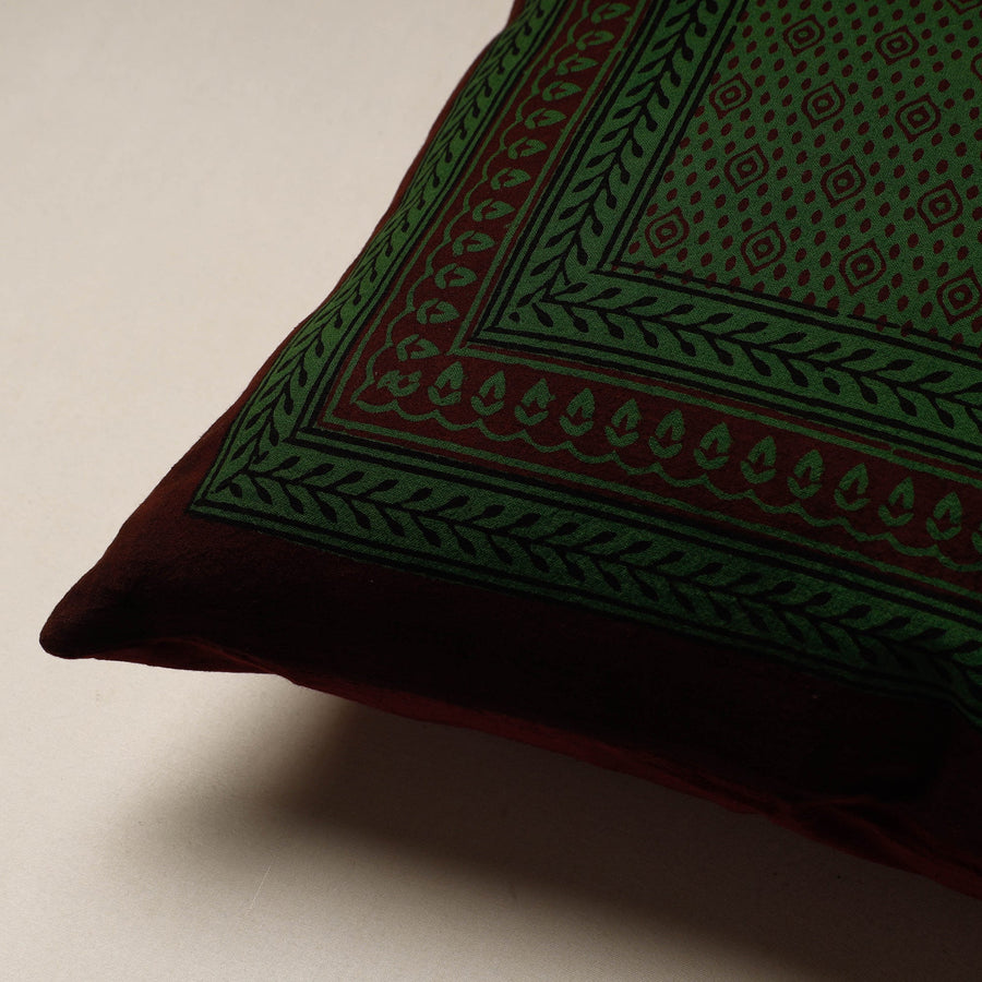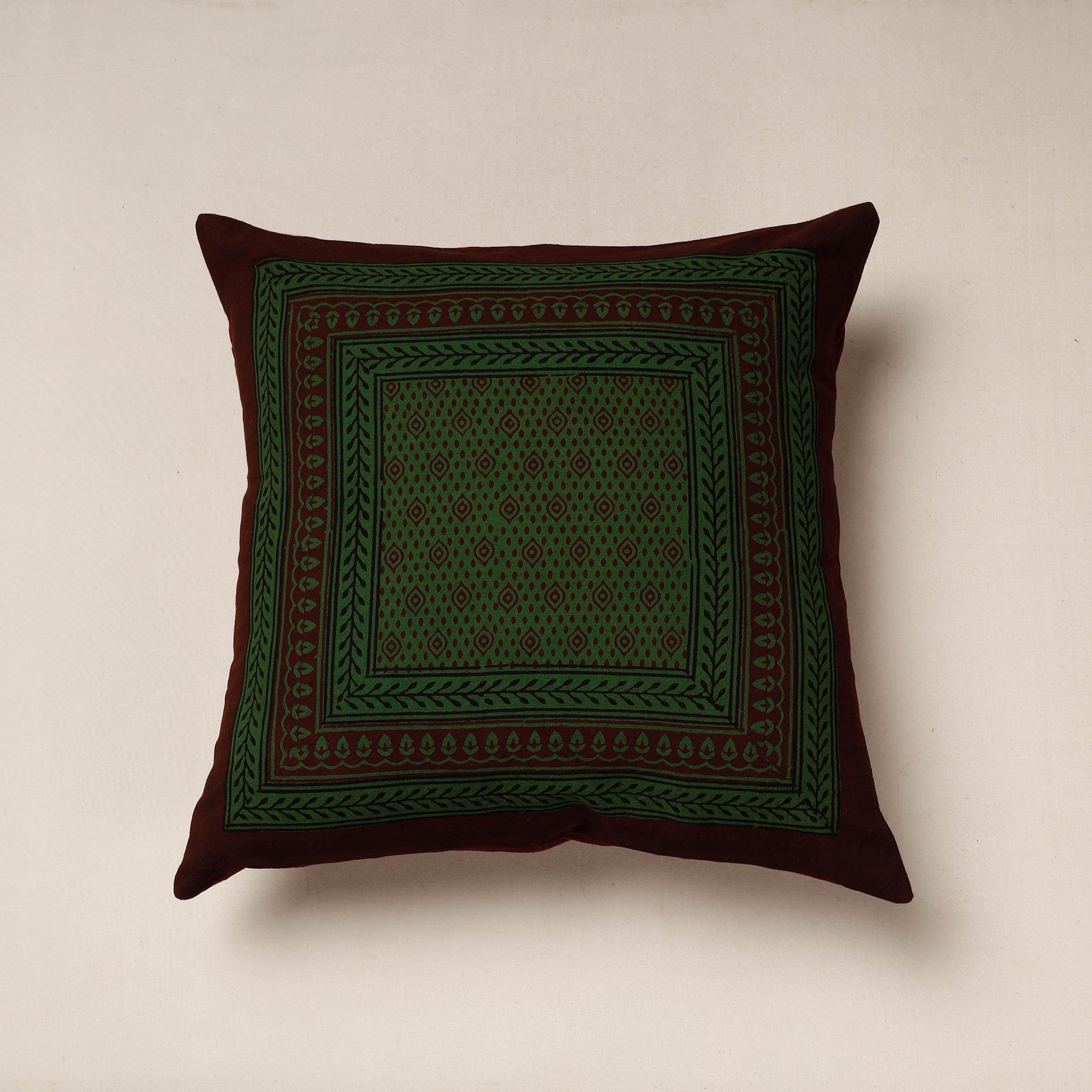 Fine quality green bagh block printing cotton cushion cover, made using natural dyes through traditional processes by master artisan practiced in Bagh, the Dhar district of Madhya Pradesh.