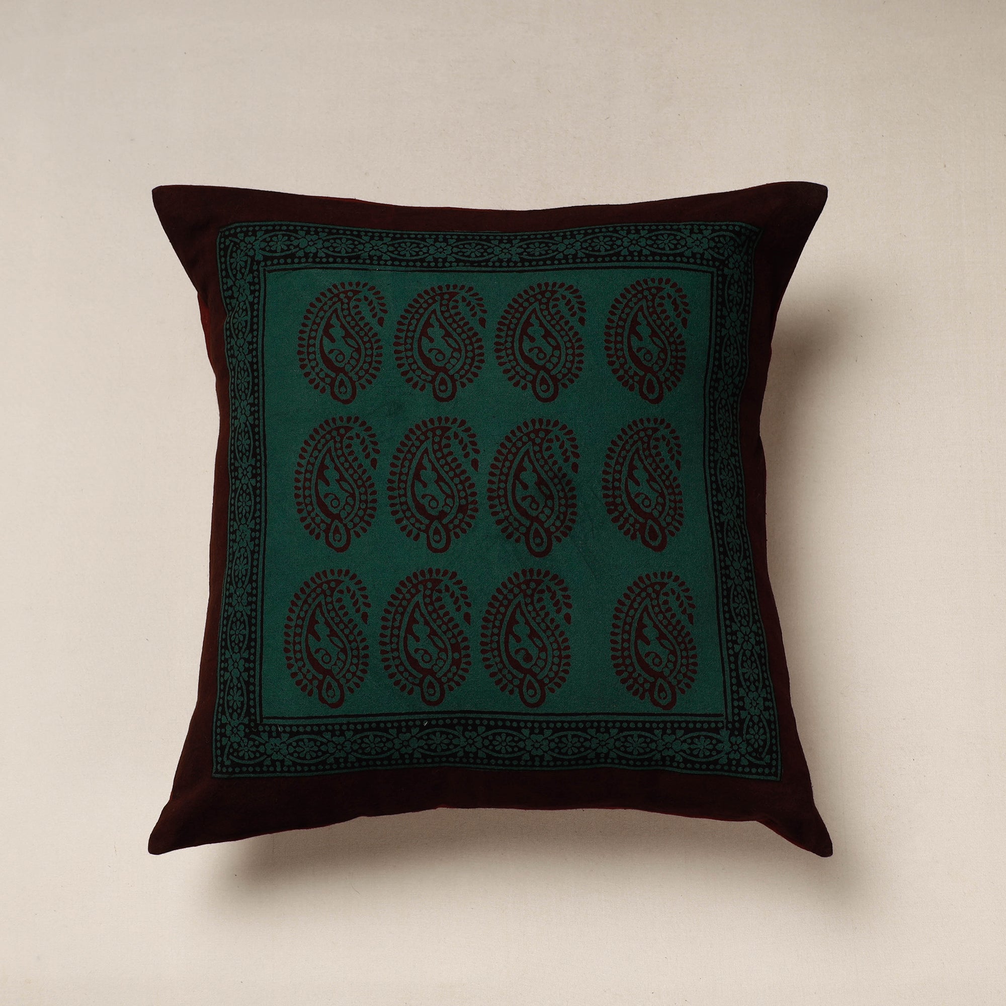 Fine quality green bagh block printing cotton cushion cover, made using natural dyes through traditional processes by master artisan practiced in Bagh, the Dhar district of Madhya Pradesh.