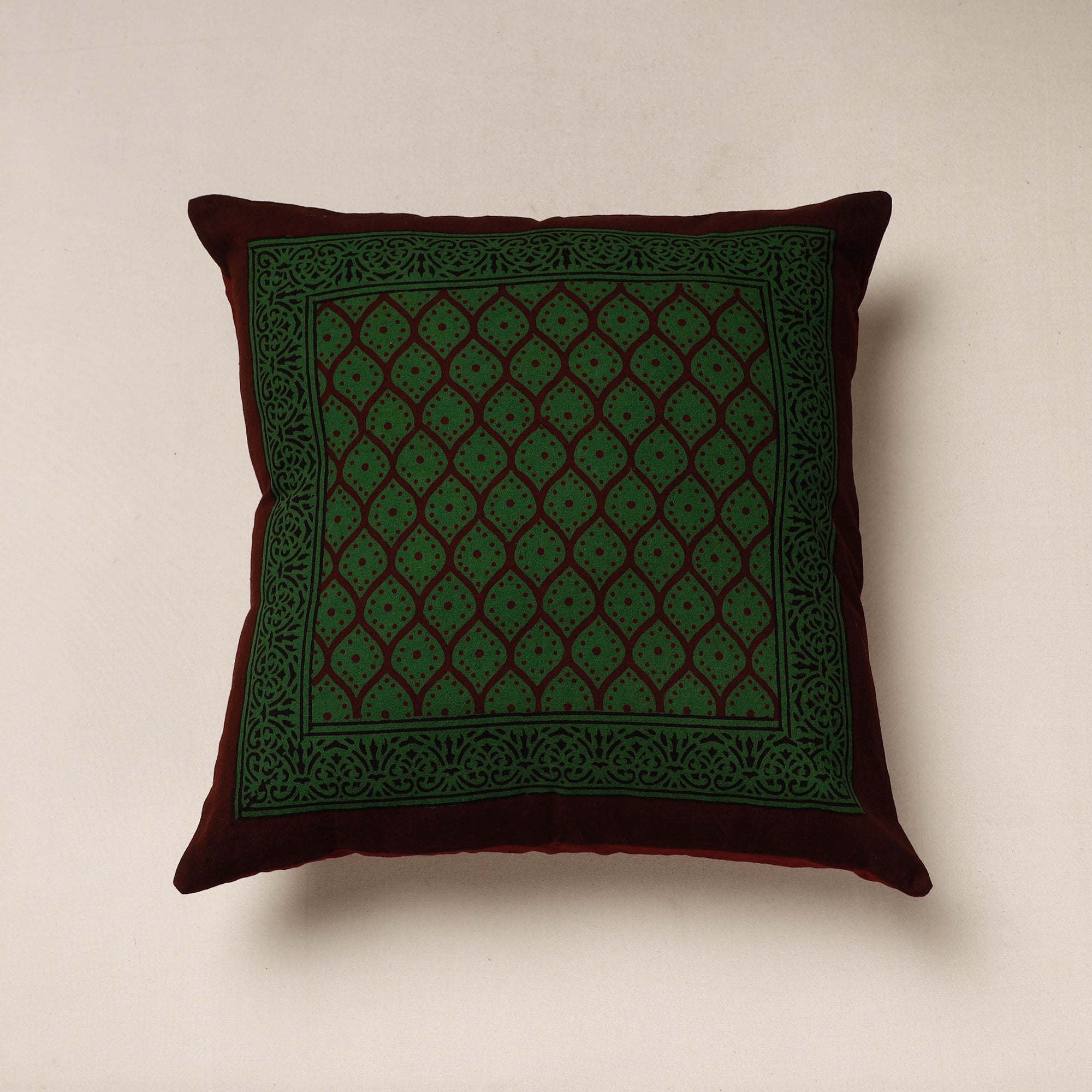Fine quality green bagh block printing cotton cushion cover, made using natural dyes through traditional processes by master artisan practiced in Bagh, the Dhar district of Madhya Pradesh.