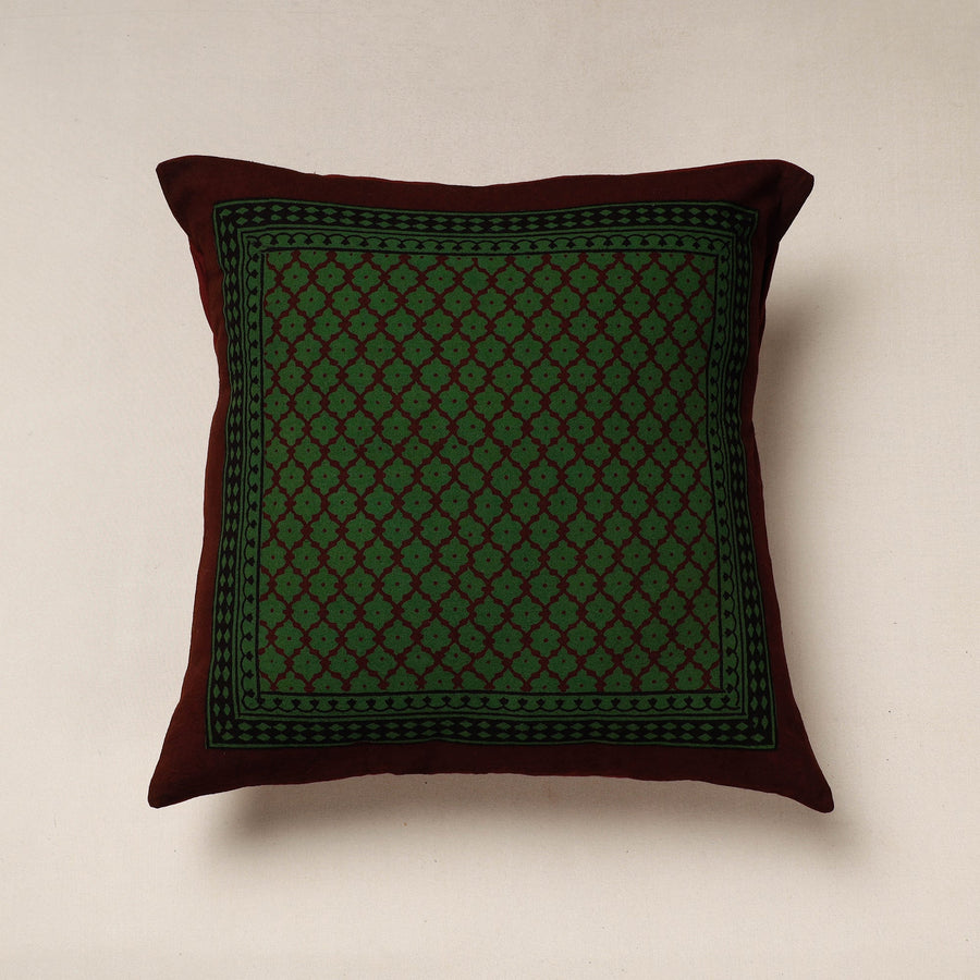 Fine quality green bagh block printing cotton cushion cover, made using natural dyes through traditional processes by master artisan practiced in Bagh, the Dhar district of Madhya Pradesh.