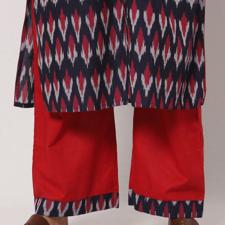 Look and feel beautiful in this uniquely designed pochampally ikat cotton side pocket long kurta with palazzo & dupatta set. This cotton suit makes you comfortable with ease all day long. This suit is perfect for your daily outing and for a special occasion. Ikat has lovely patterns in extremely beautiful colours. Ikat fabrics are world famous for their colours, texture and designs. This is a power-loom dress material, only hand tie-dye process has been involved.