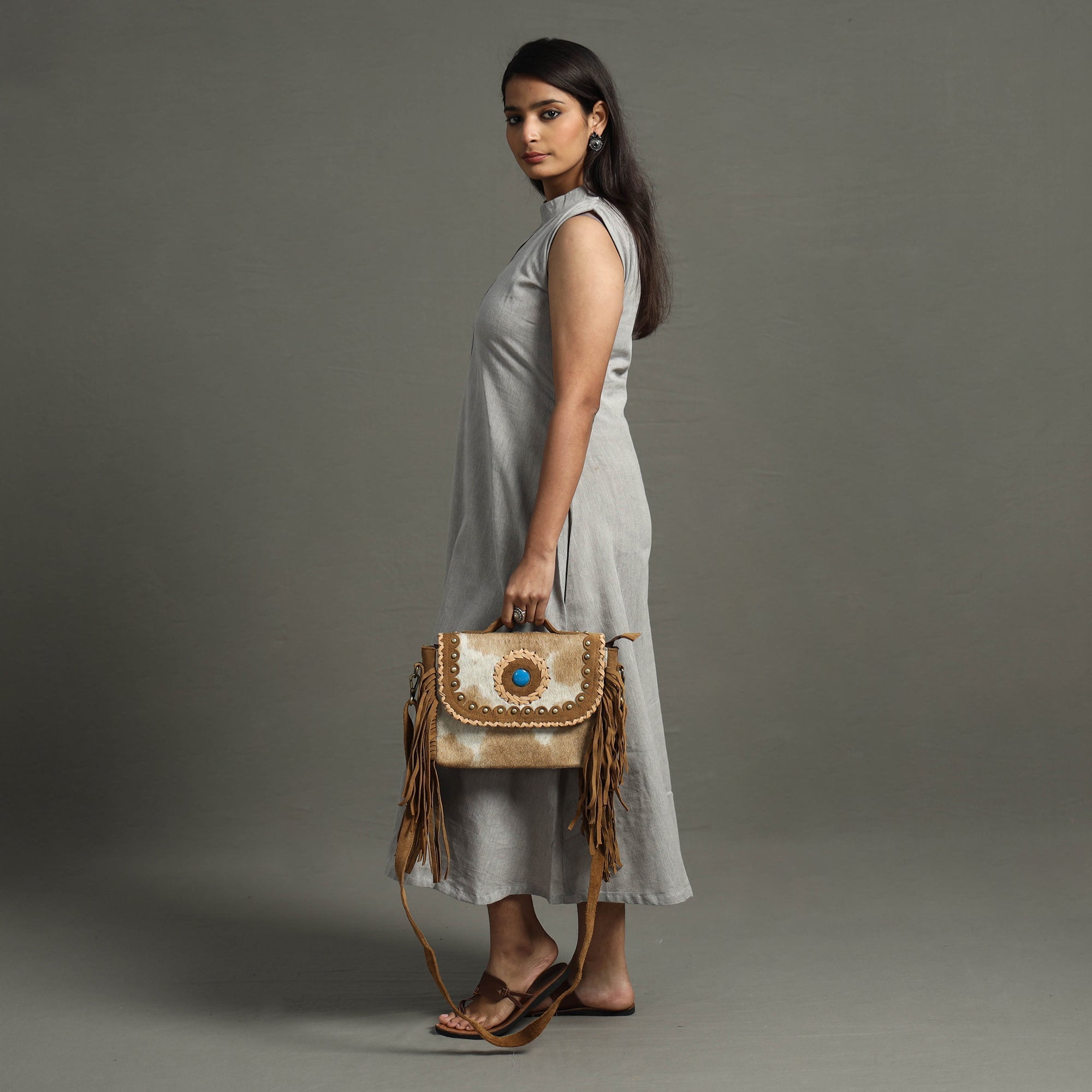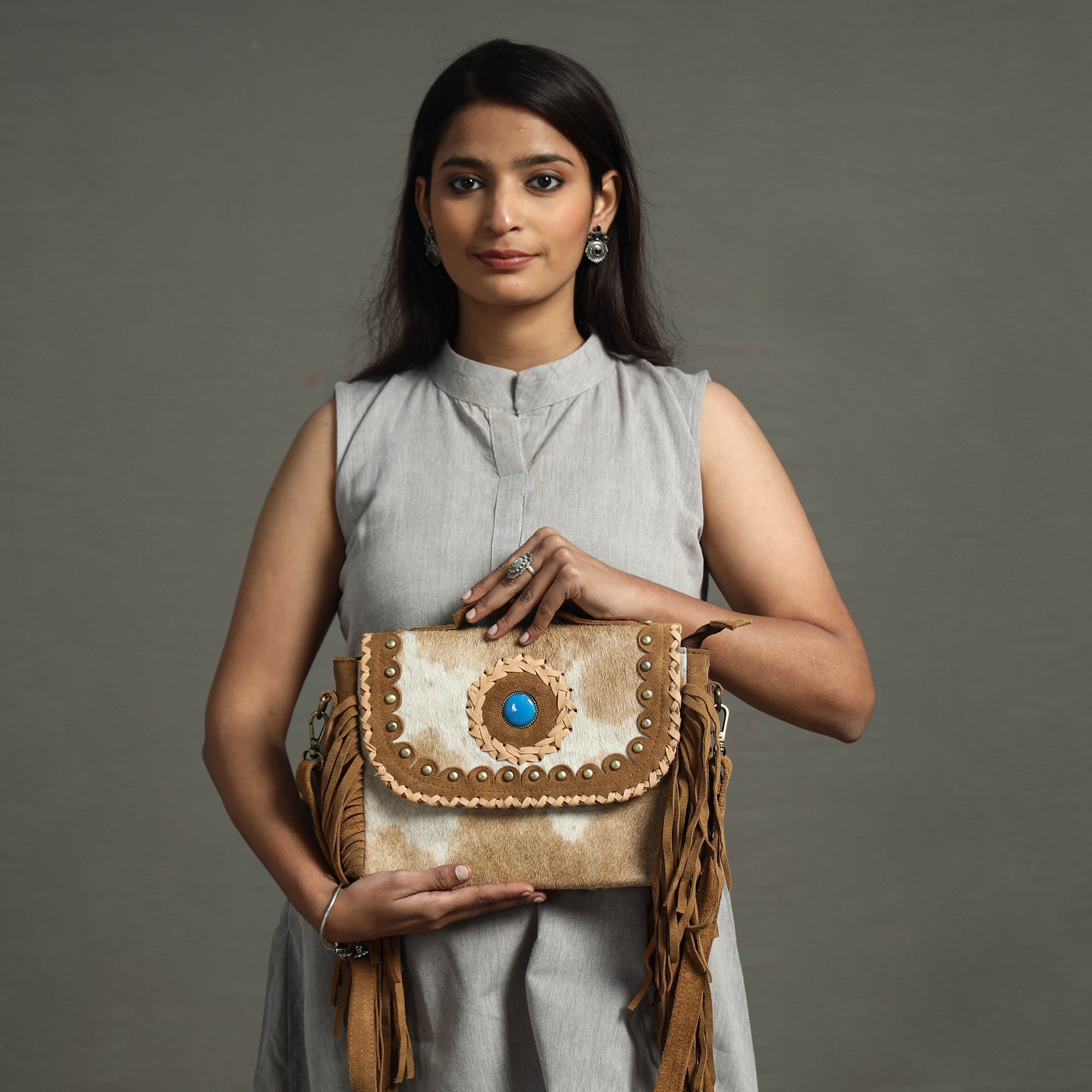 This brown handcrafted fringed sling bag is made from fur leather with blue stone bead. This bag comes with a detachable and adjustable sling. It has one zipper and one simple pocket inside, one zipper pocket outside, and ample space to keep most of your essentials.