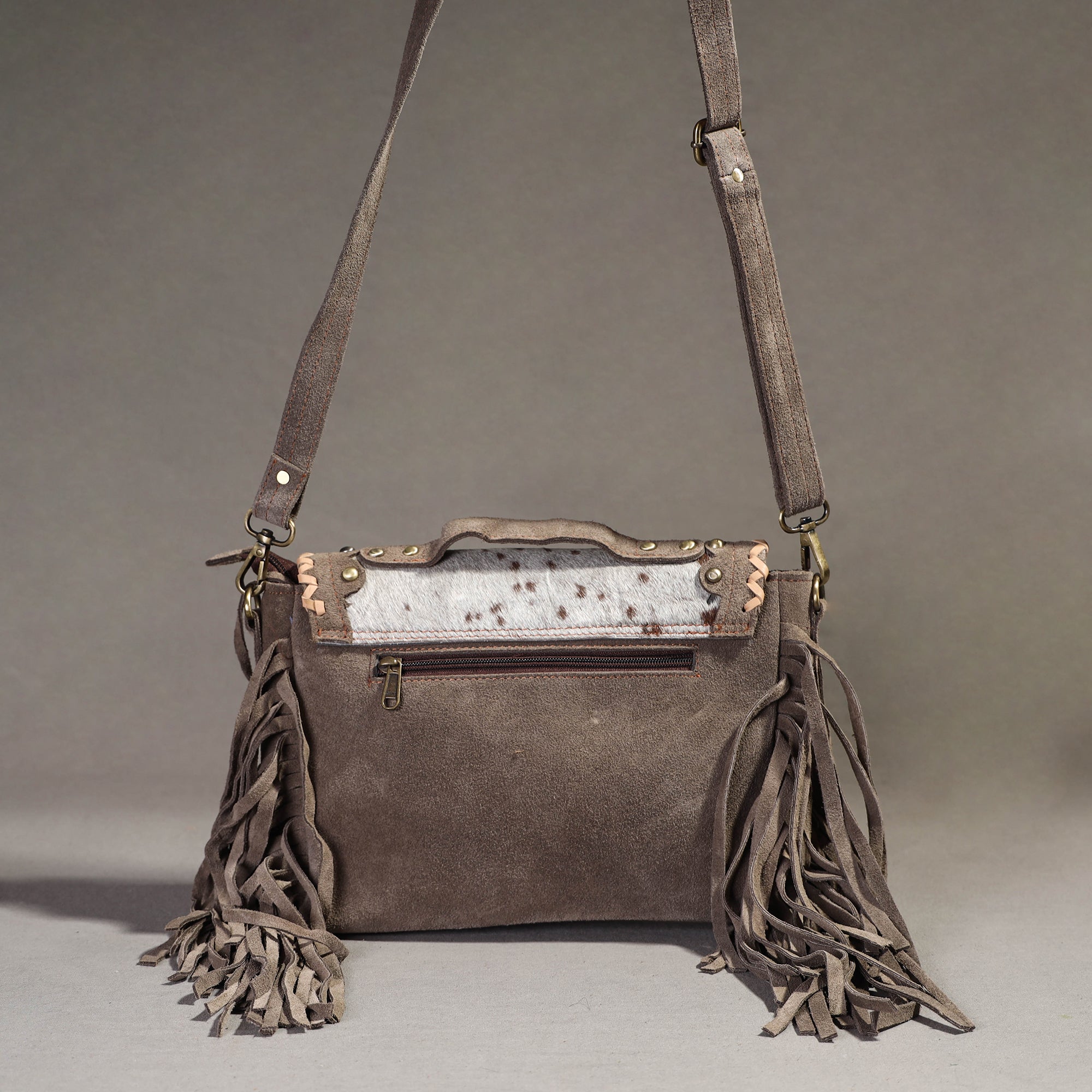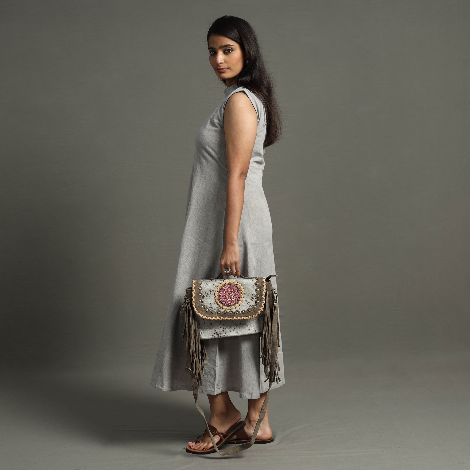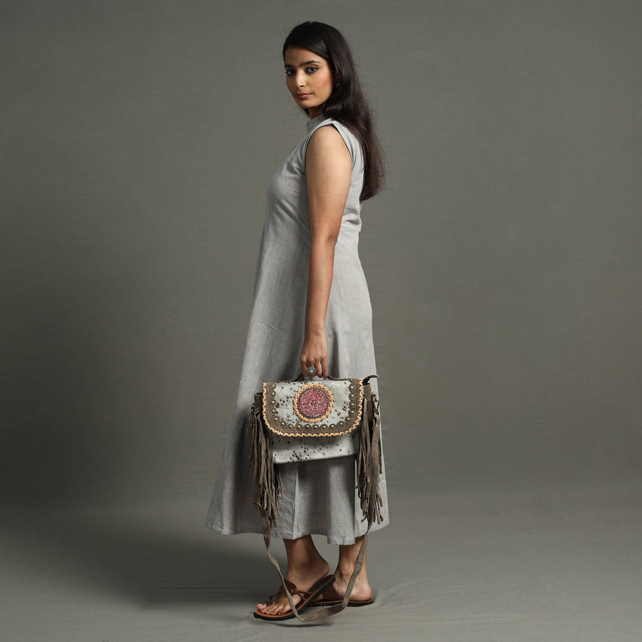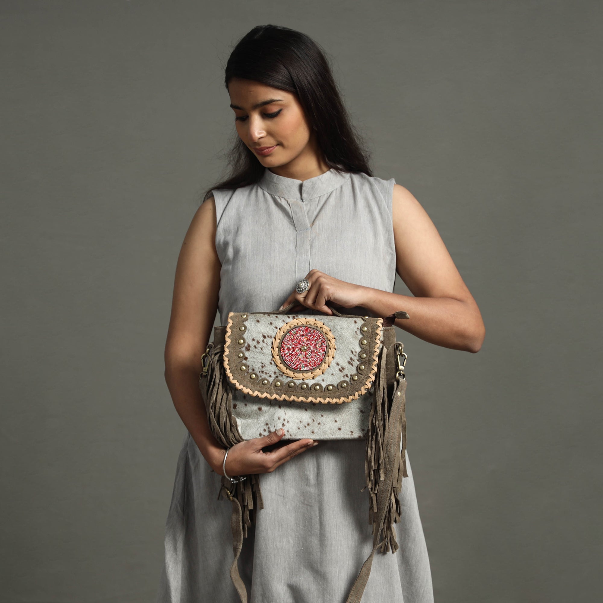 This grey handcrafted fringed sling bag is made from fur leather with blue stone bead. This bag comes with a detachable and adjustable sling. It has one zipper and one simple pocket inside, one zipper pocket outside, and ample space to keep most of your essentials.