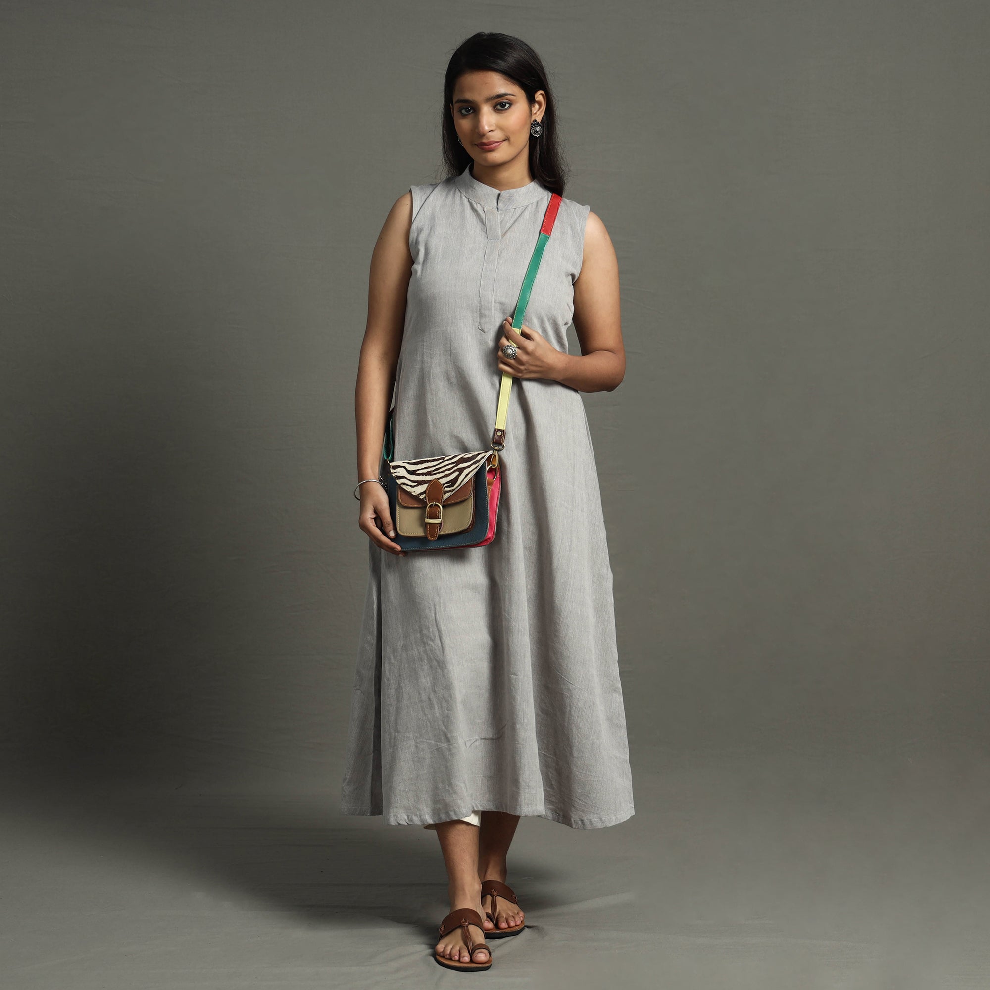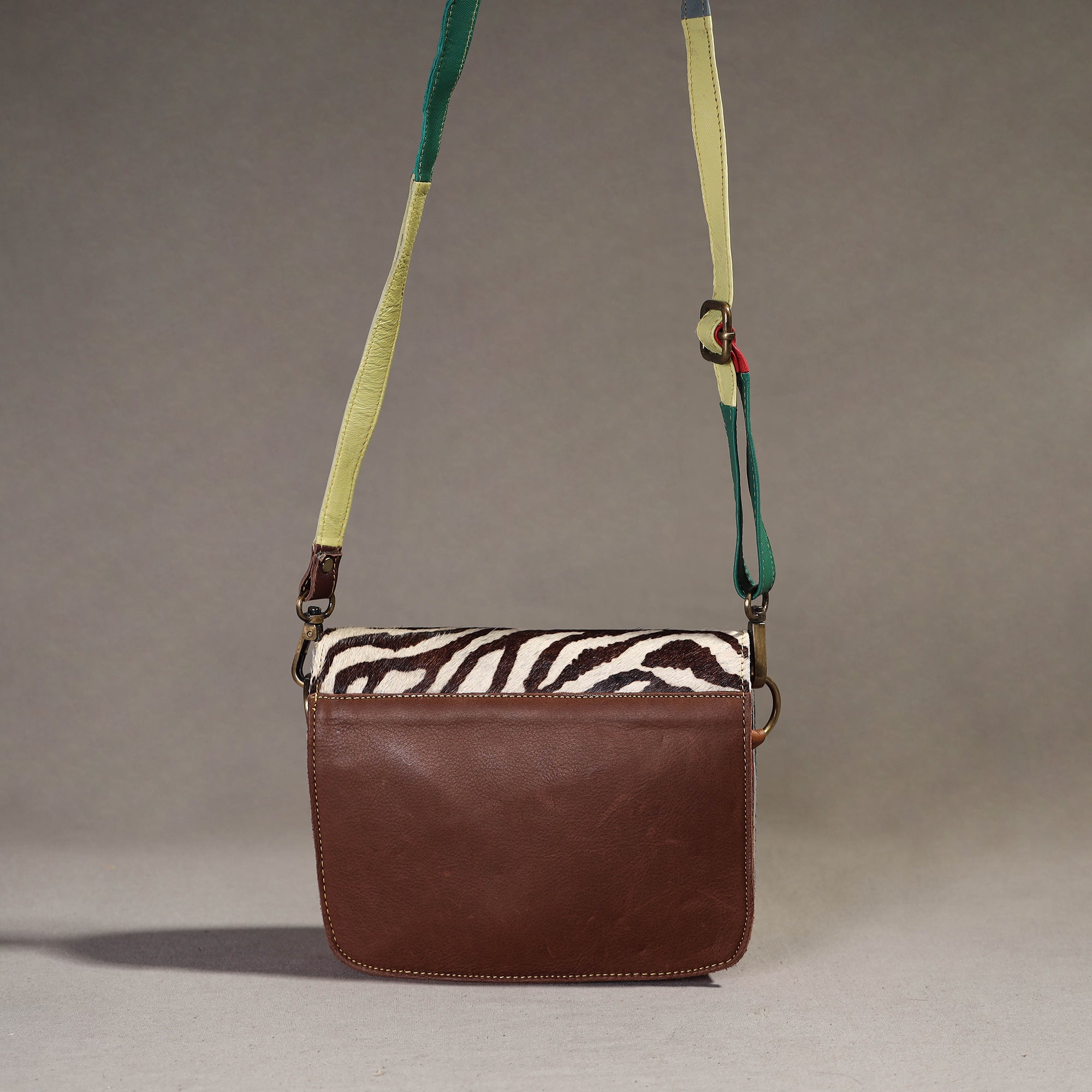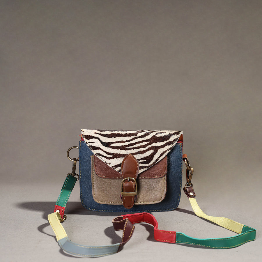 This multicolor handcrafted sling bag with a fur leather flap is made from recycled leather that has been left over from factories. The quality of this leather is fantastic, but due to the small quantities, it’s deemed "useless" by the manufacturer. This bag comes with a detachable and adjustable sling. It has one zipper pocket inside and one magnetic lock pocket outside, as well as ample space to keep most of your essentials.