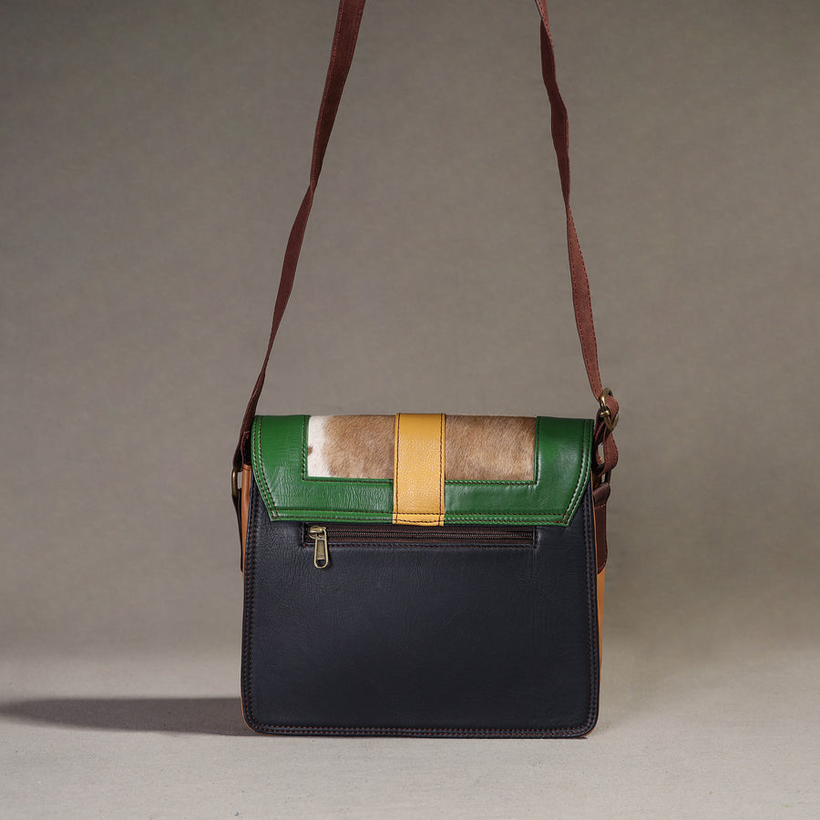 This multicolor handcrafted sling bag with a fur leather flap is made from recycled leather that has been left over from factories. The quality of this leather is fantastic, but due to the small quantities, it’s deemed "useless" by the manufacturer. This bag comes with an adjustable sling. It has one zipper pocket inside and one zipper pocket outside, as well as ample space to keep most of your essentials.