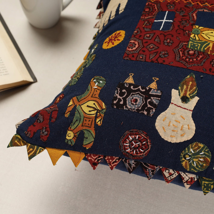 Blue - Kala Raksha Applique Cutwork Cotton Cushion Cover (16 x 16 in)