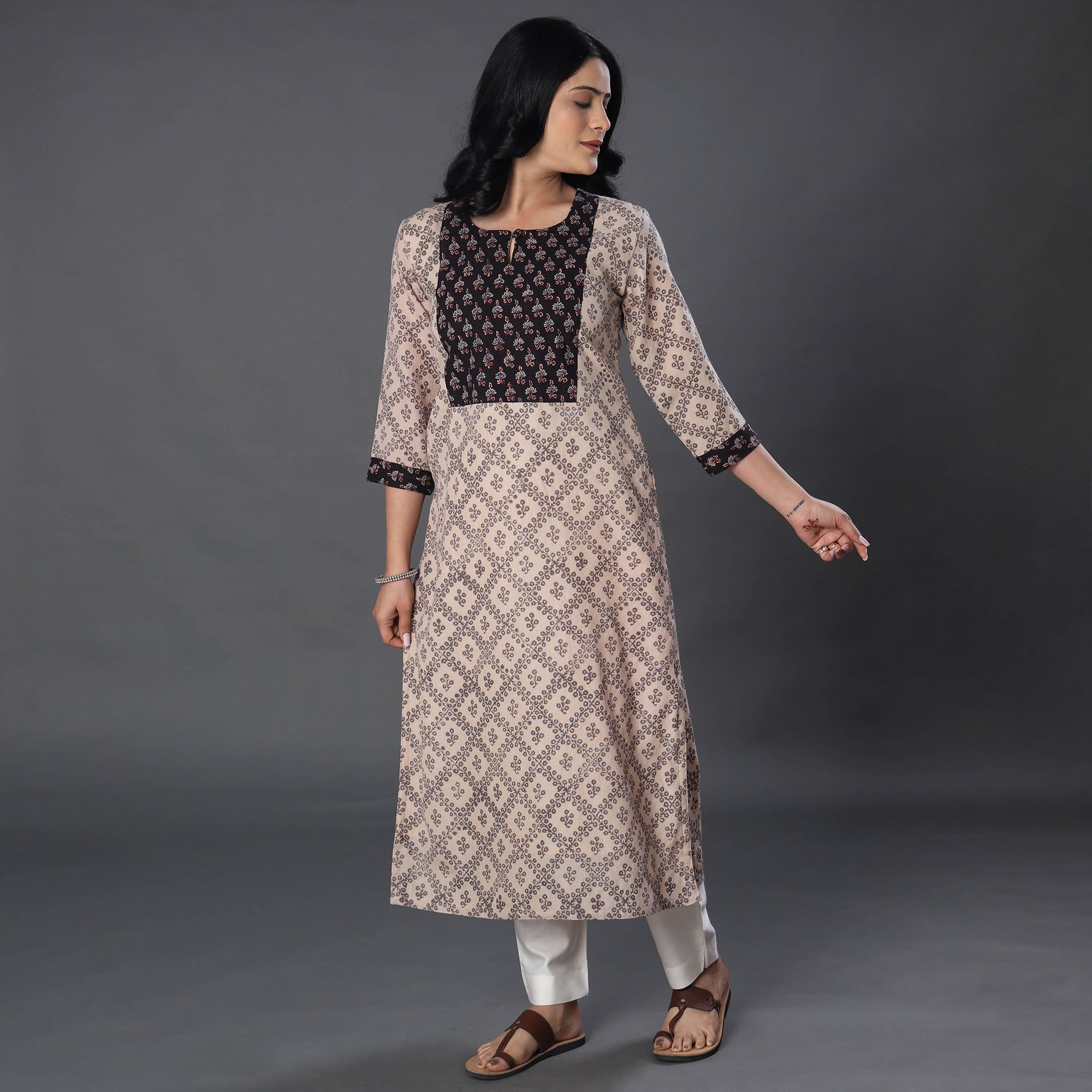 Look and feel beautiful in this uniquely designed block printed merino wool long kalamkari kurta with side pocket and ajrak cotton patch. This merino wool Kurta makes you comfortable with ease all day long. Showcasing an assortment of hand block printed motifs inspired by traditional kalamkari painting. Kalamkari is the earliest and more complex techniques of block-printing.