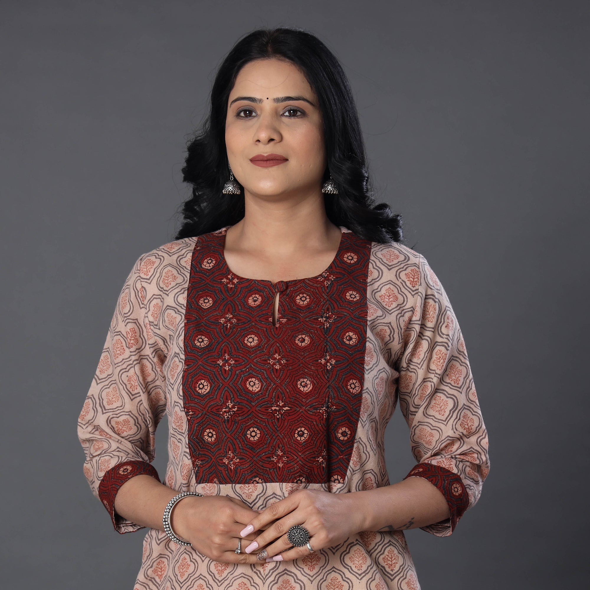 Look and feel beautiful in this uniquely designed block printed merino wool long kalamkari kurta with side pocket and ajrak cotton patch. This merino wool kurta makes you comfortable with ease all day long. Showcasing an assortment of hand block printed motifs inspired by traditional kalamkari painting. Kalamkari is the earliest and more complex techniques of block-printing.