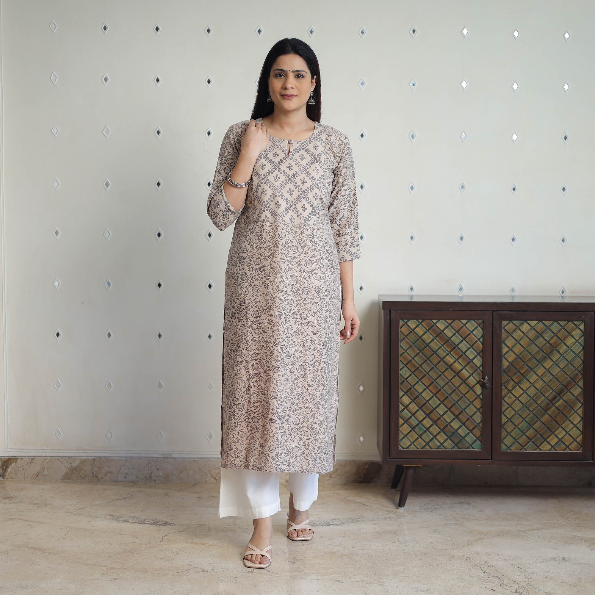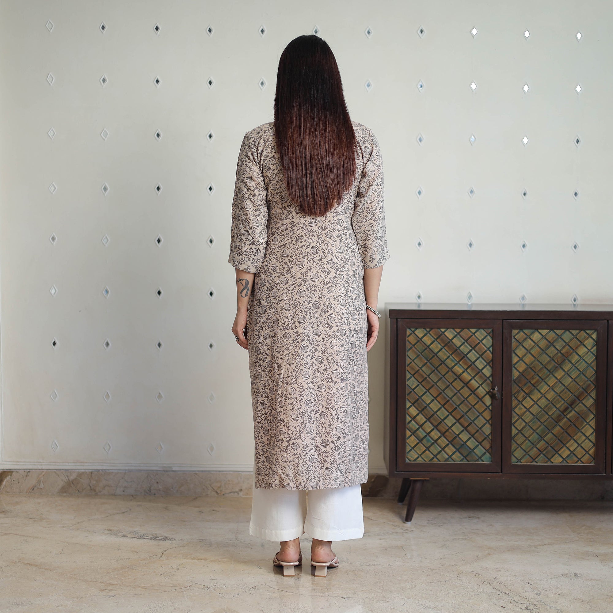 Look and feel beautiful in this uniquely designed beige wool handwoven pedana kalamkari kurta with side pocket. This merino wool Kurta makes you comfortable with ease all day long. Showcasing an assortment of hand block printed motifs inspired by traditional kalamkari painting. Kalamkari is the earliest and more complex techniques of block-printing.