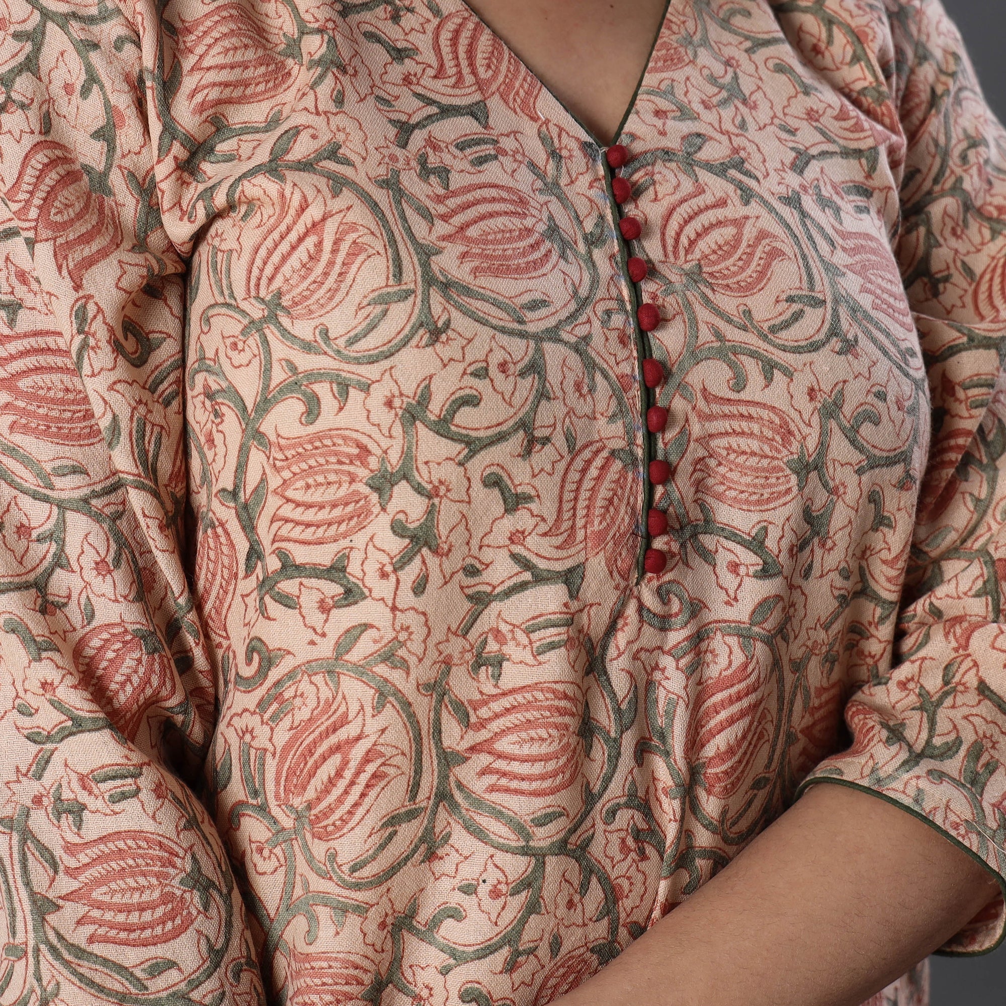 Look and feel beautiful in this uniquely designed beige block printed merino wool long kalamkari kurta with side pocket. This merino wool kurta makes you comfortable with ease all day long. Showcasing an assortment of hand block printed motifs inspired by traditional kalamkari painting. Kalamkari is the earliest and more complex techniques of block-printing.