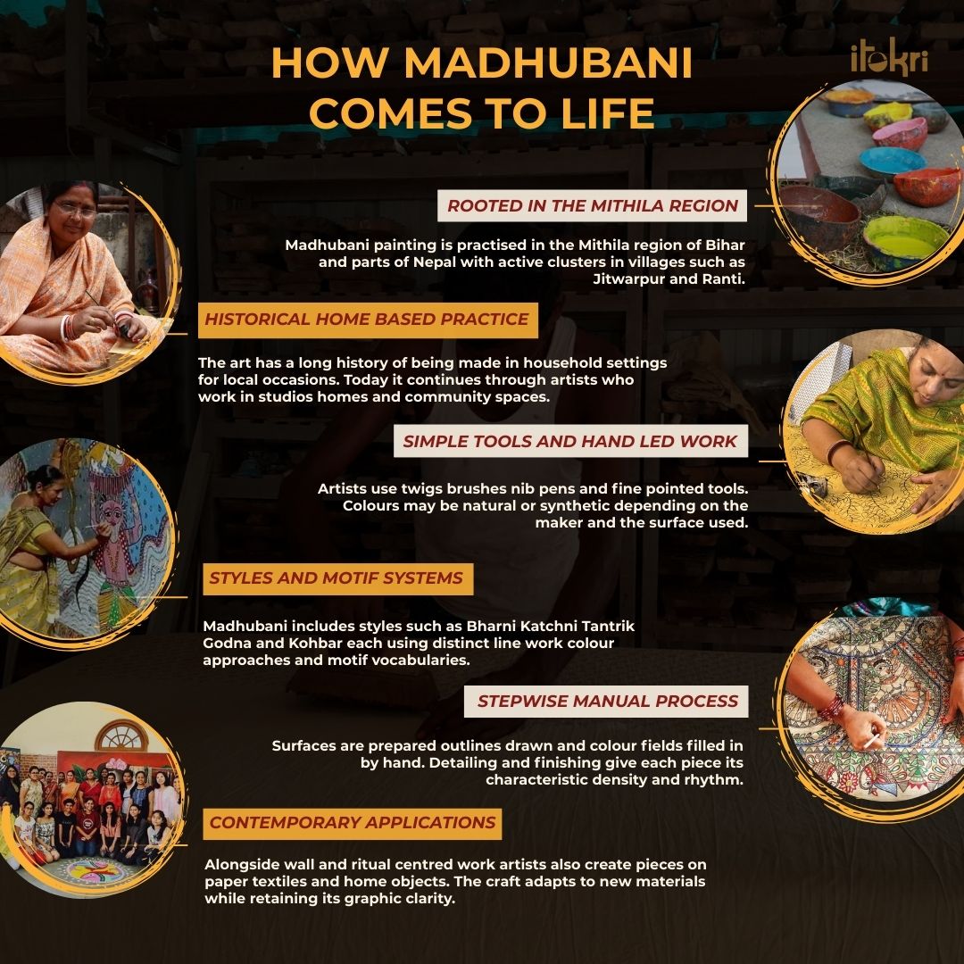 Madhubani Art is a style of Indian painting, practiced in the Mithila region of India and Nepal. These paintings are created mostly by women. Natural colours are used and paintings are done on canvases, walls, floors of sacred places, etc.