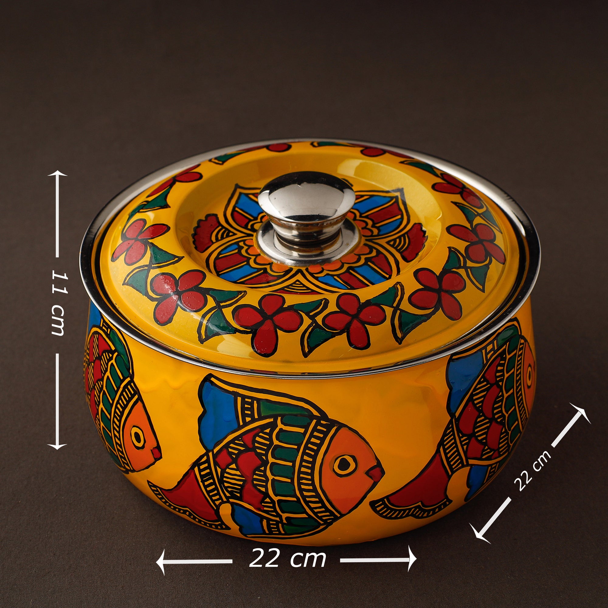 | Material | Yellow madhubani handpainted stainless steel casserole with waterproof oil based paint on very high quality stainless steel by the master artisans Hira Devi from Bihar. This casserole can be used in kitchen daily. |