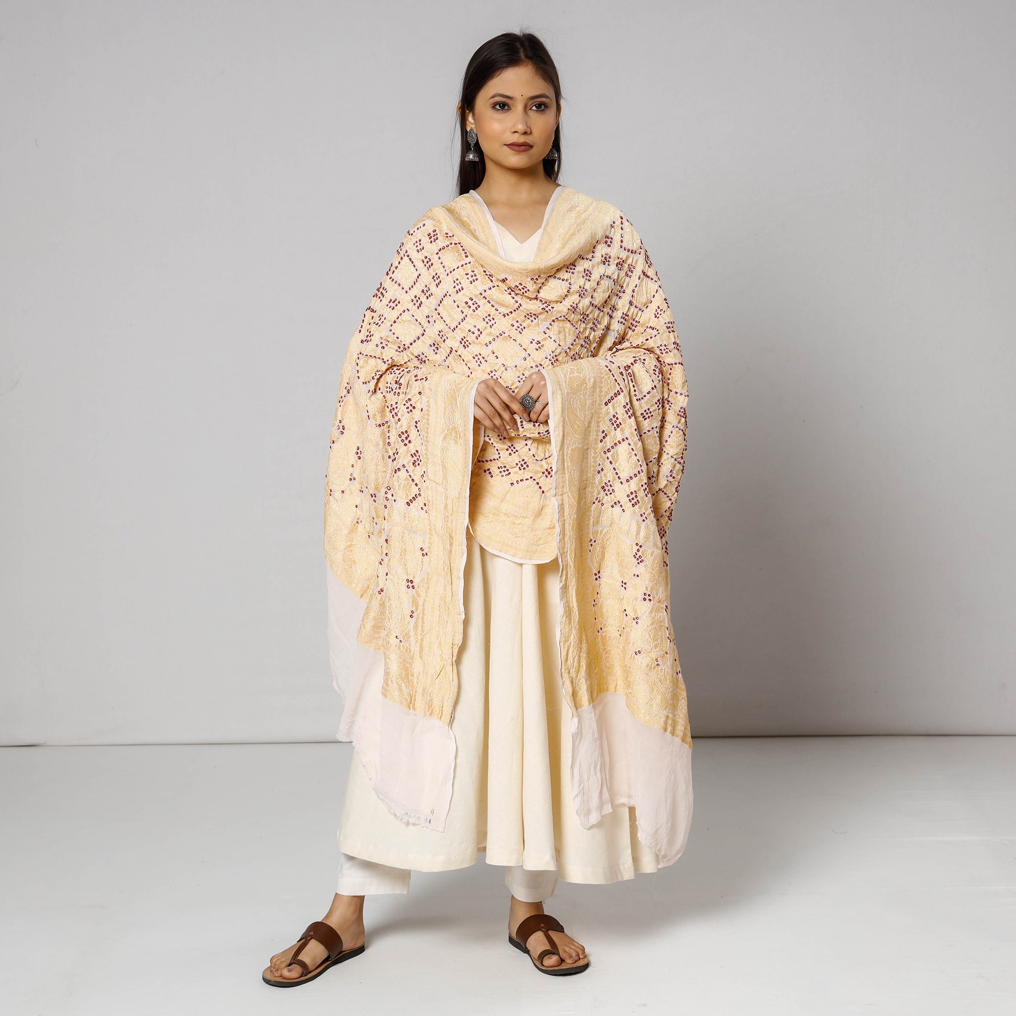 Fine quality kutch bandhani tie-dye georgette banarasi neem zari jaal dupatta featuring majestic bandhani pattern, tie-dyed using the traditional technique practised by the artisans of Kutch. The art of bandhani (bandhej) is highly skilled process. The technique involves dyeing a fabric which is tied tightly with a thread at several points.