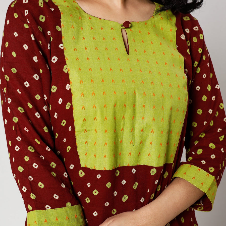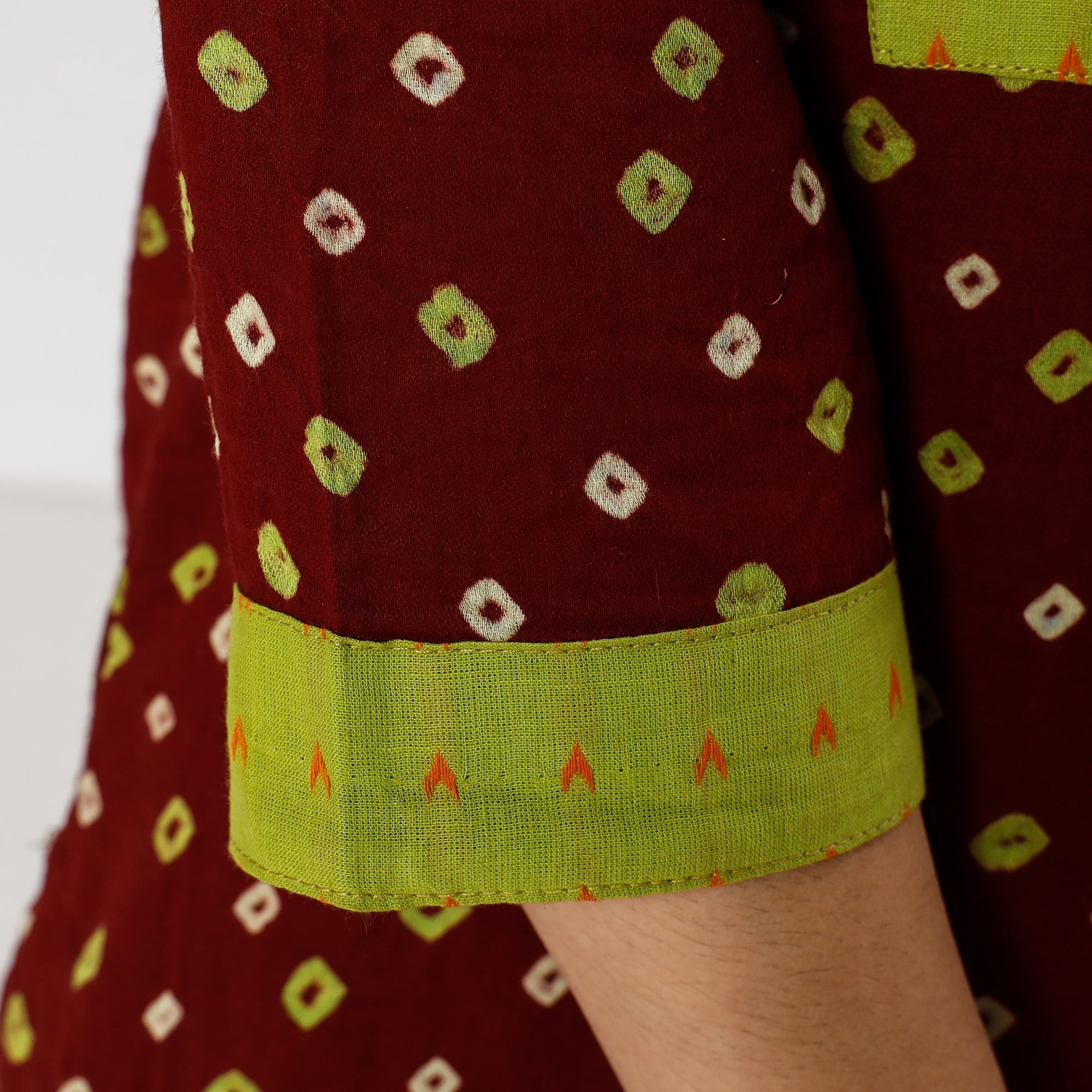 Look and feel beautiful in this uniquely designed bandhani tie-dye cotton long kurta with Jacquard cotton patch and one side pocket. This cotton kurta makes you comfortable with ease all day long. This kurta is perfect for your daily outing and for a special occasion. Bandhani is a tie-dye soft cotton fabric, featuring majestic bandhani pattern, tie & dyed using the traditional technique practised by skilled artisans and their families in Kutch.